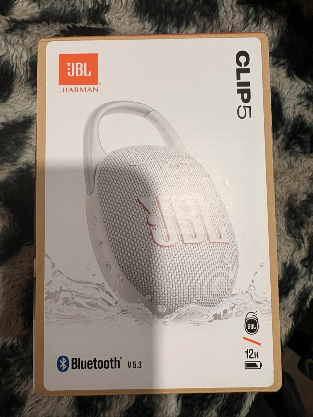 Selling a brand new JBL Clip 5 portable Bluetooth speaker! It's still in its original box. Enjoy up to 12 hours of playtime with Bluetooth V5.3 connectivity. Perfect for on-the-go listening!
