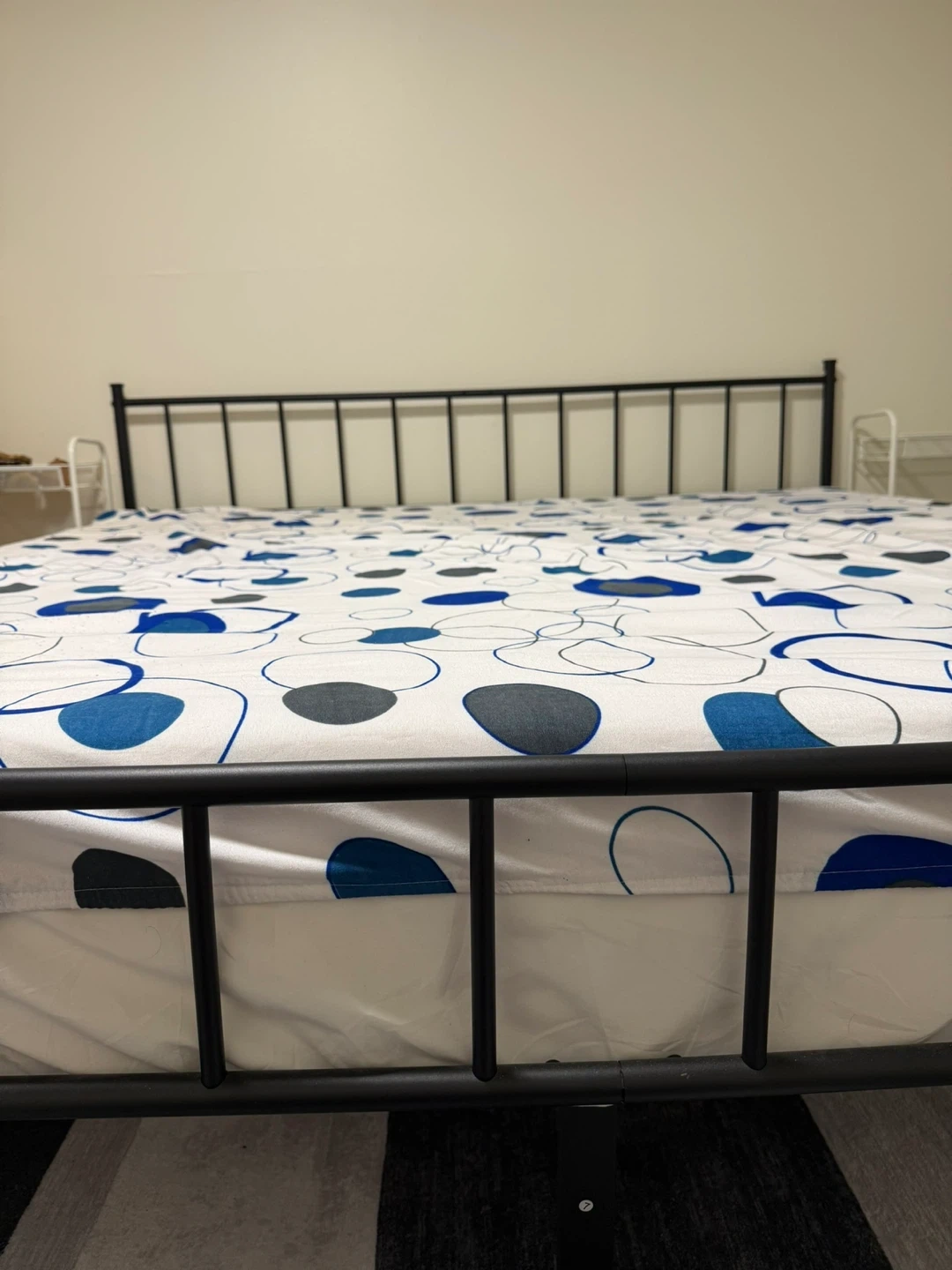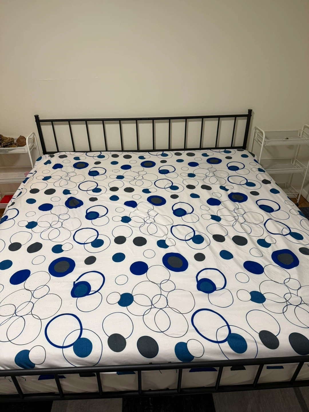 Selling a bed frame in great condition. It's a sturdy, black metal frame that would look great in any bedroom. The dimensions are king size . It's easy to assemble and disassemble for moving. Feel free to reach out if you're interested!