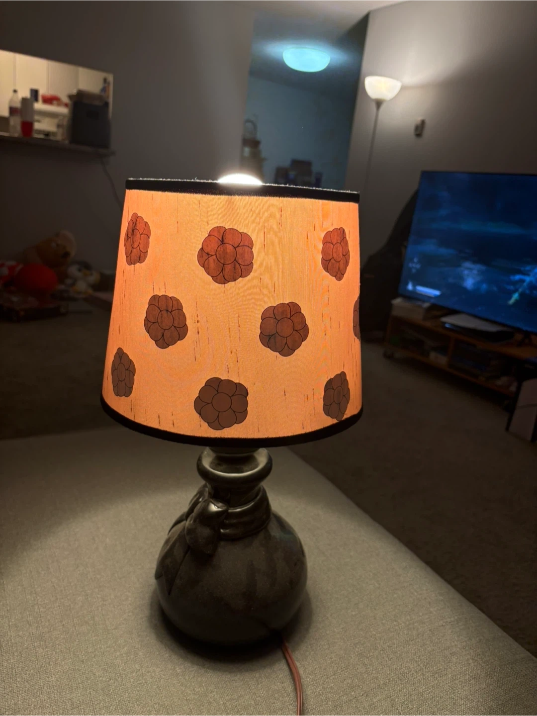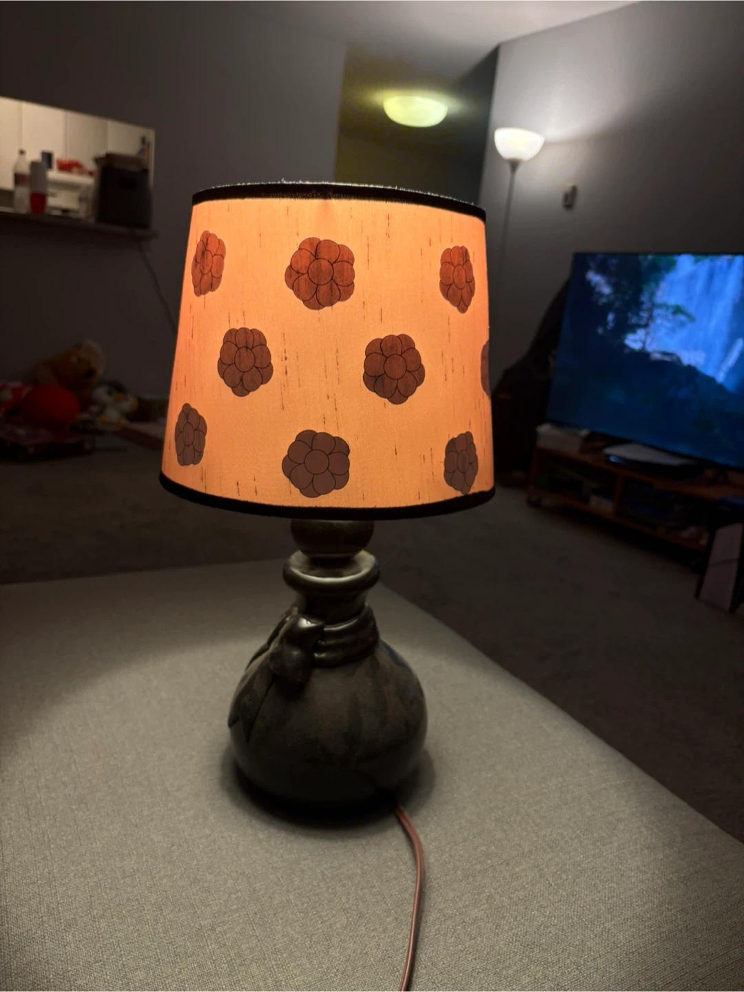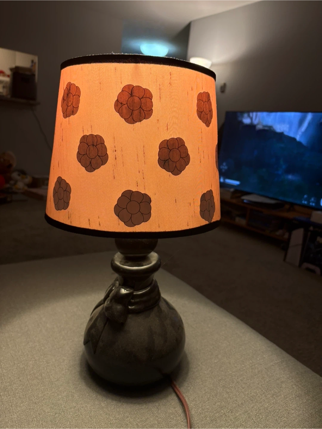 This is a cute little table lamp with a unique floral pattern on the shade. It would be perfect for a bedside table or desk! The base is a dark color, and the shade is a light orange color with brown floral accents