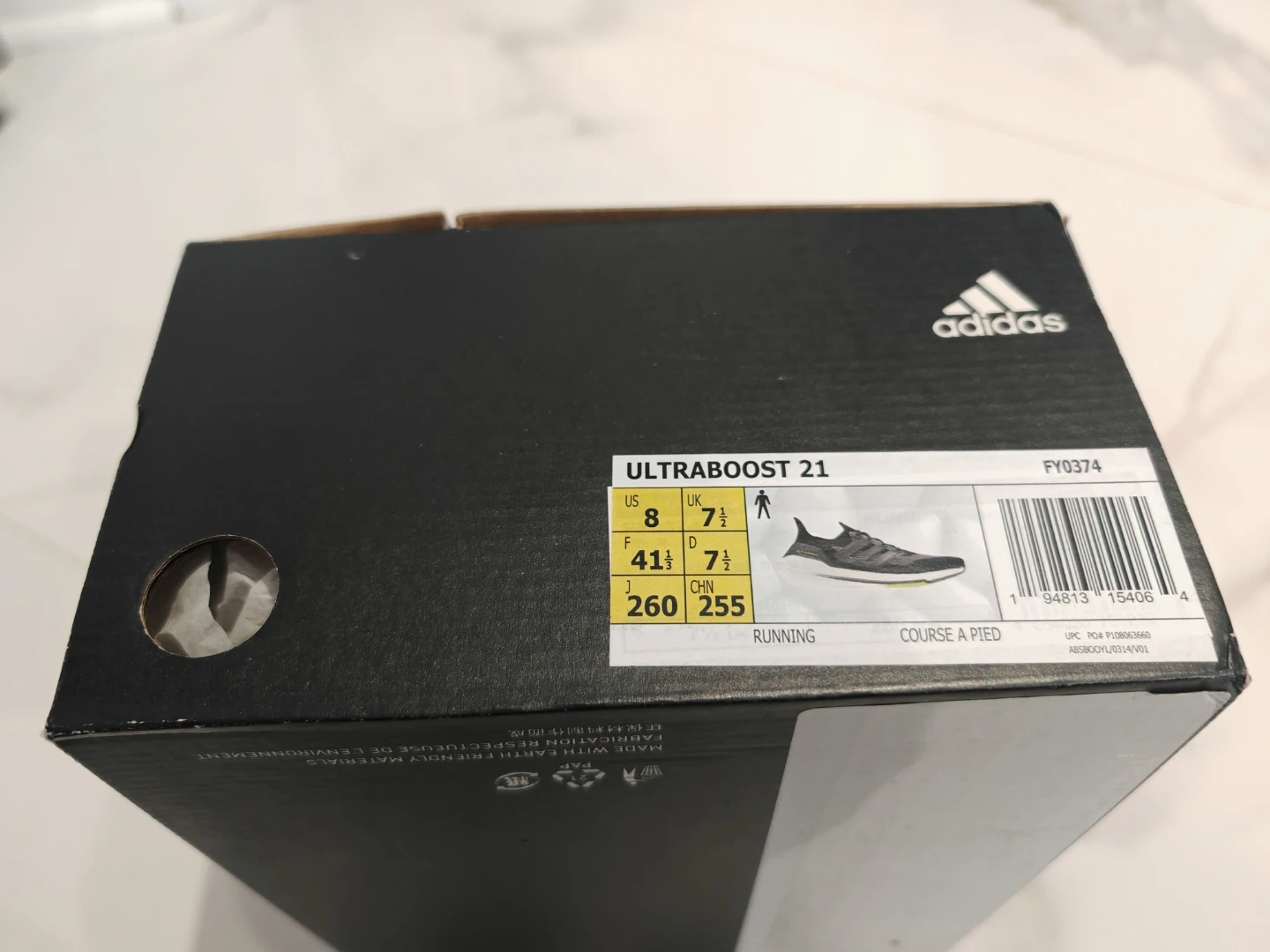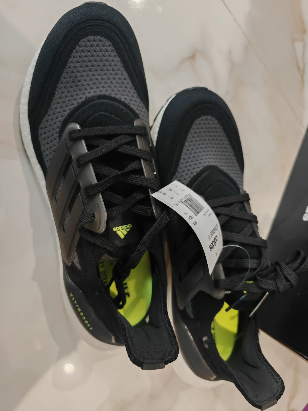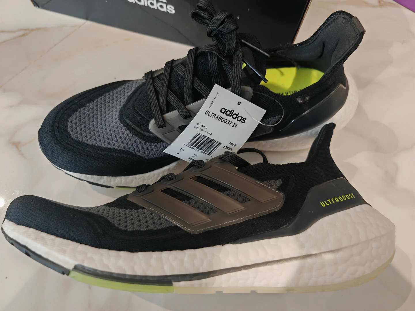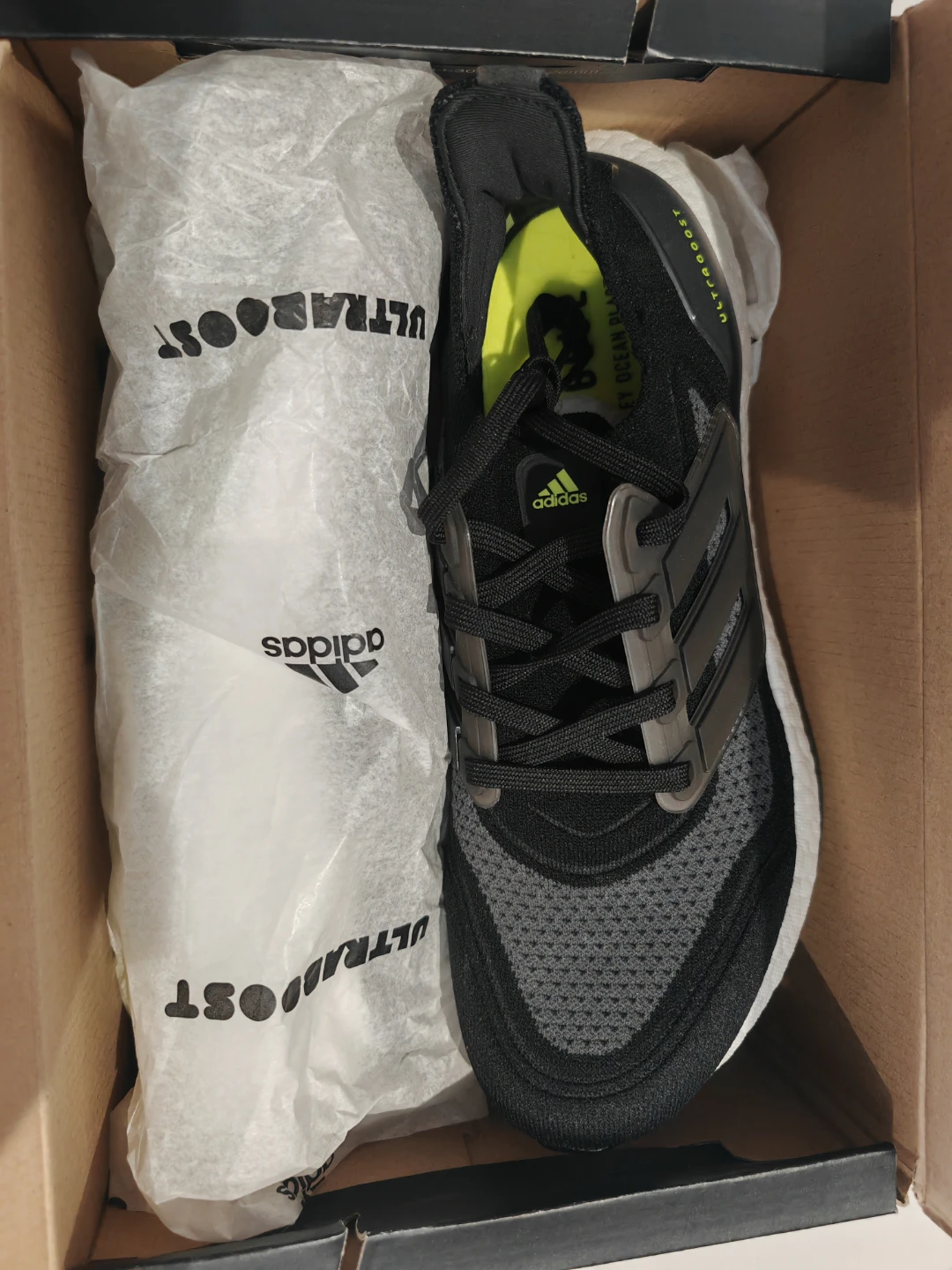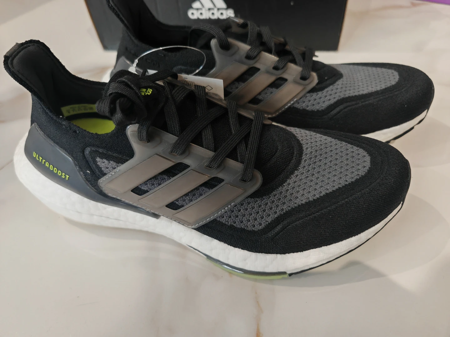 Selling a pair of Adidas Ultraboost 21 shoes in brand new with tag condition! They come in a stylish black and grey colourway. The size is Men US 8 Comes with the original box!