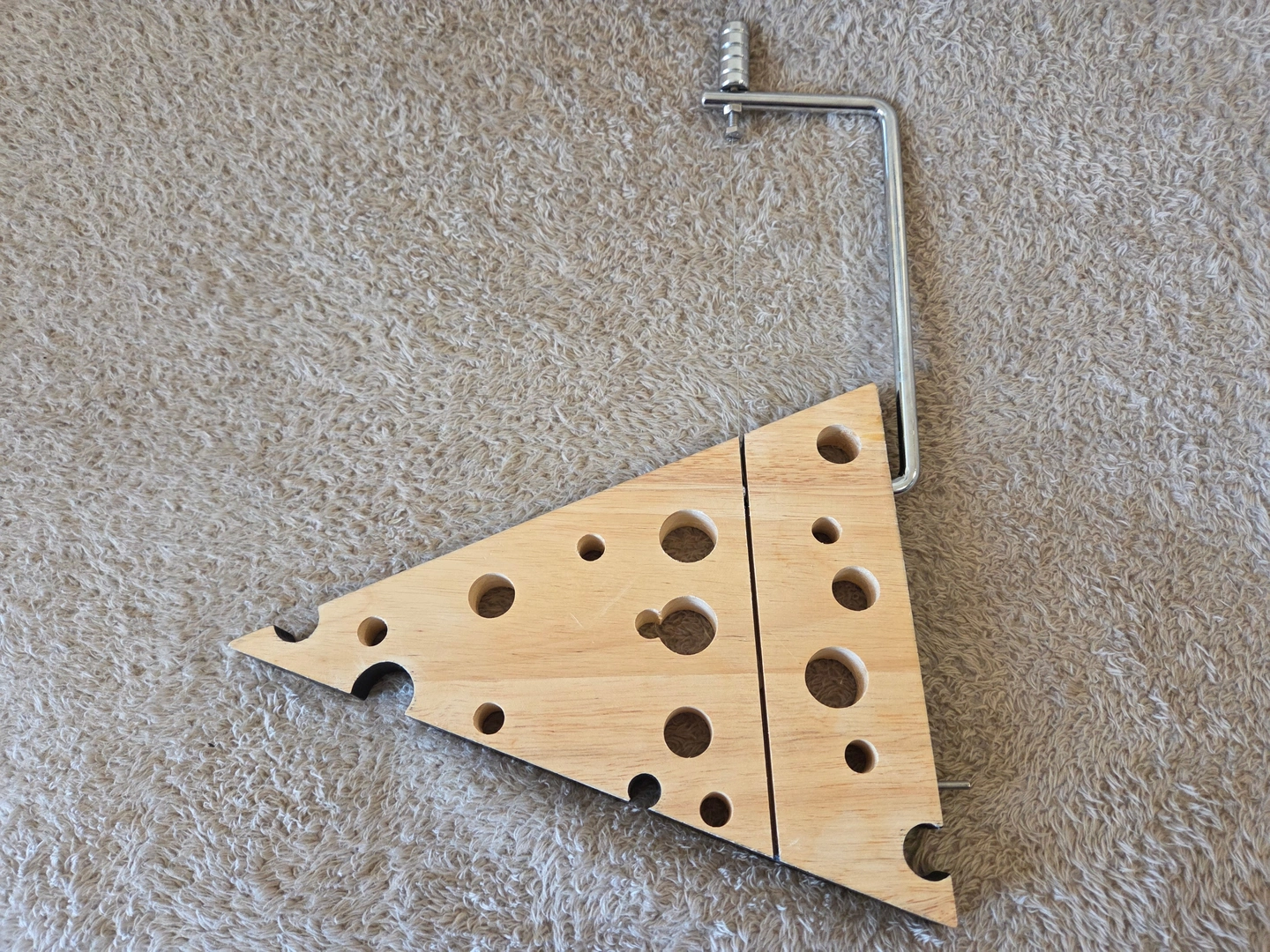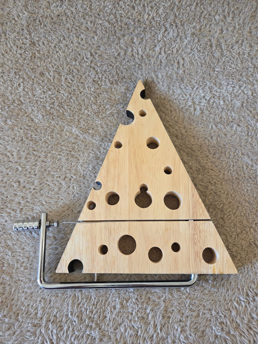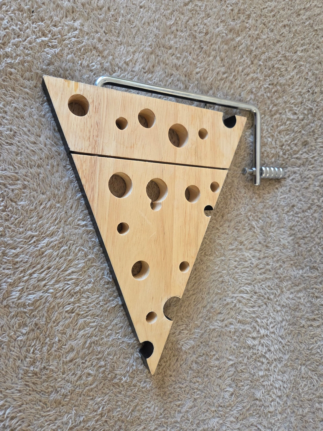Fun Swiss-wedge cheese board with an integrated wire slicer – perfect for quick, clean slices at your next get-together. Solid wood top with decorative “holes” and a sturdy metal frame.