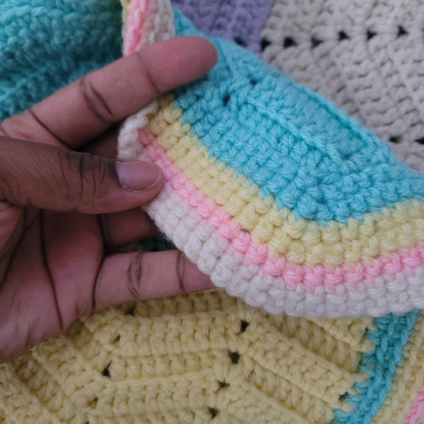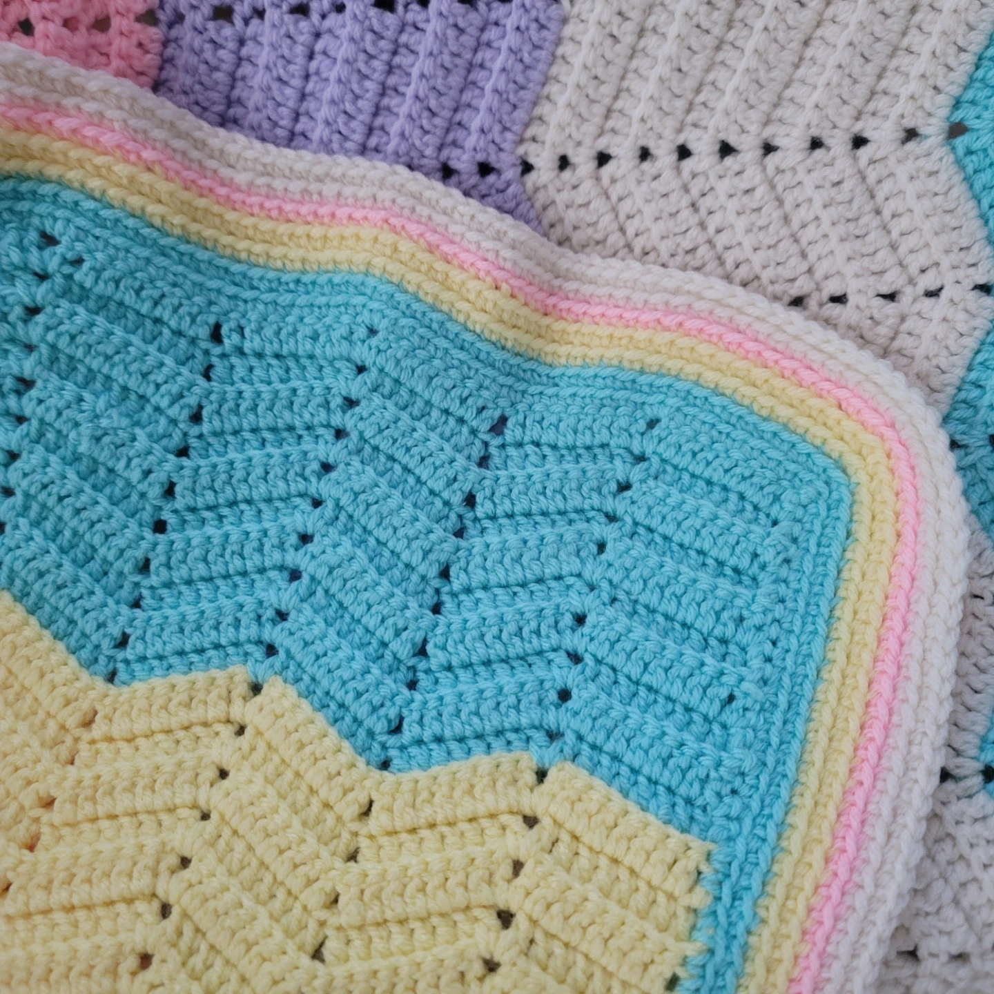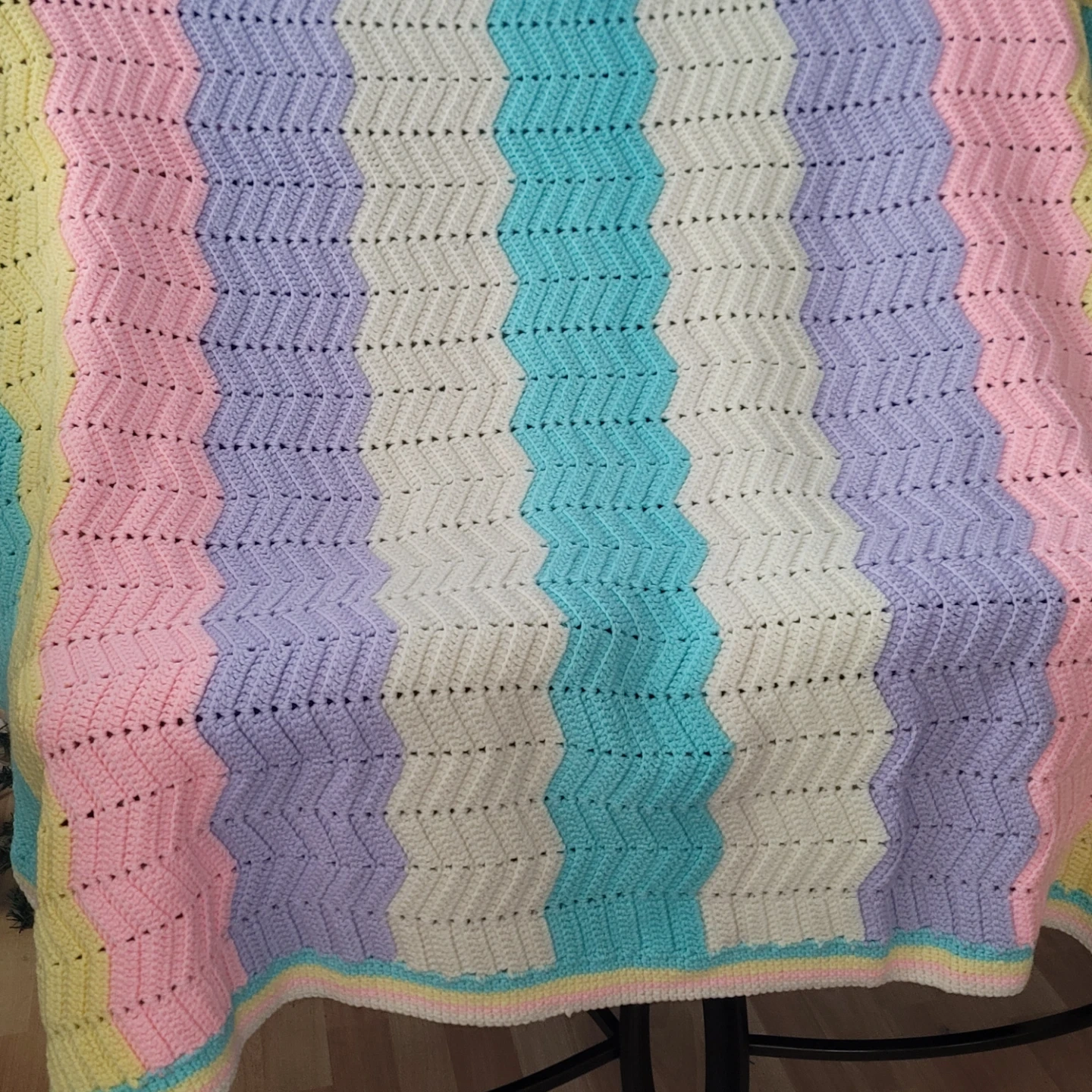 Selling a handmade crochet blanket featuring a lovely pastel colour palette. It's a soft, cozy blanket with a unique chevron pattern. Perfect for adding a touch of handmade charm to your home!