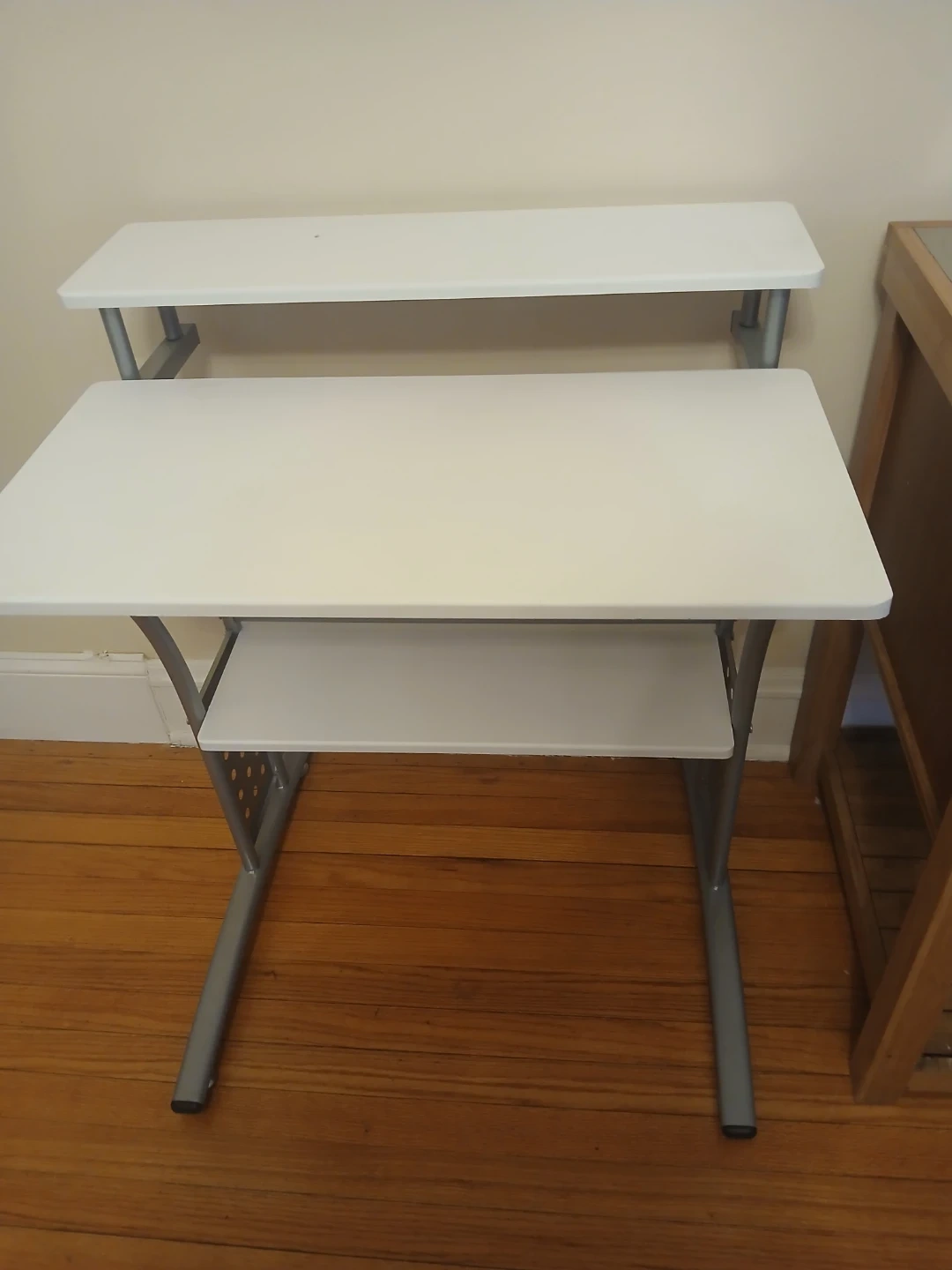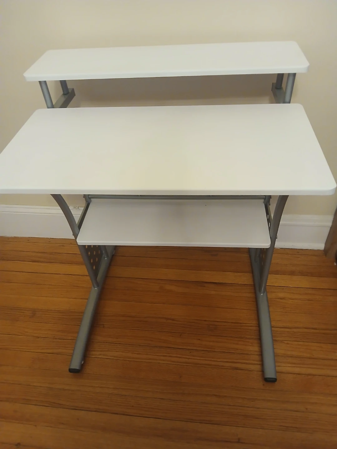 Selling a simple white computer desk with a shelf on top. It's perfect for a small space or home office. The desk is in good condition and ready for a new home. It features a pull-out keyboard tray and a sturdy metal frame.