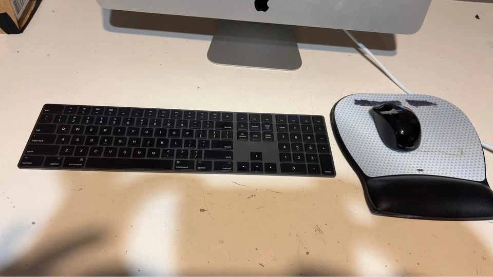 Included is the Power cable, SpaceGrey Apple Magic Keyboard with numeric keypad, Mouse and mouse pad.