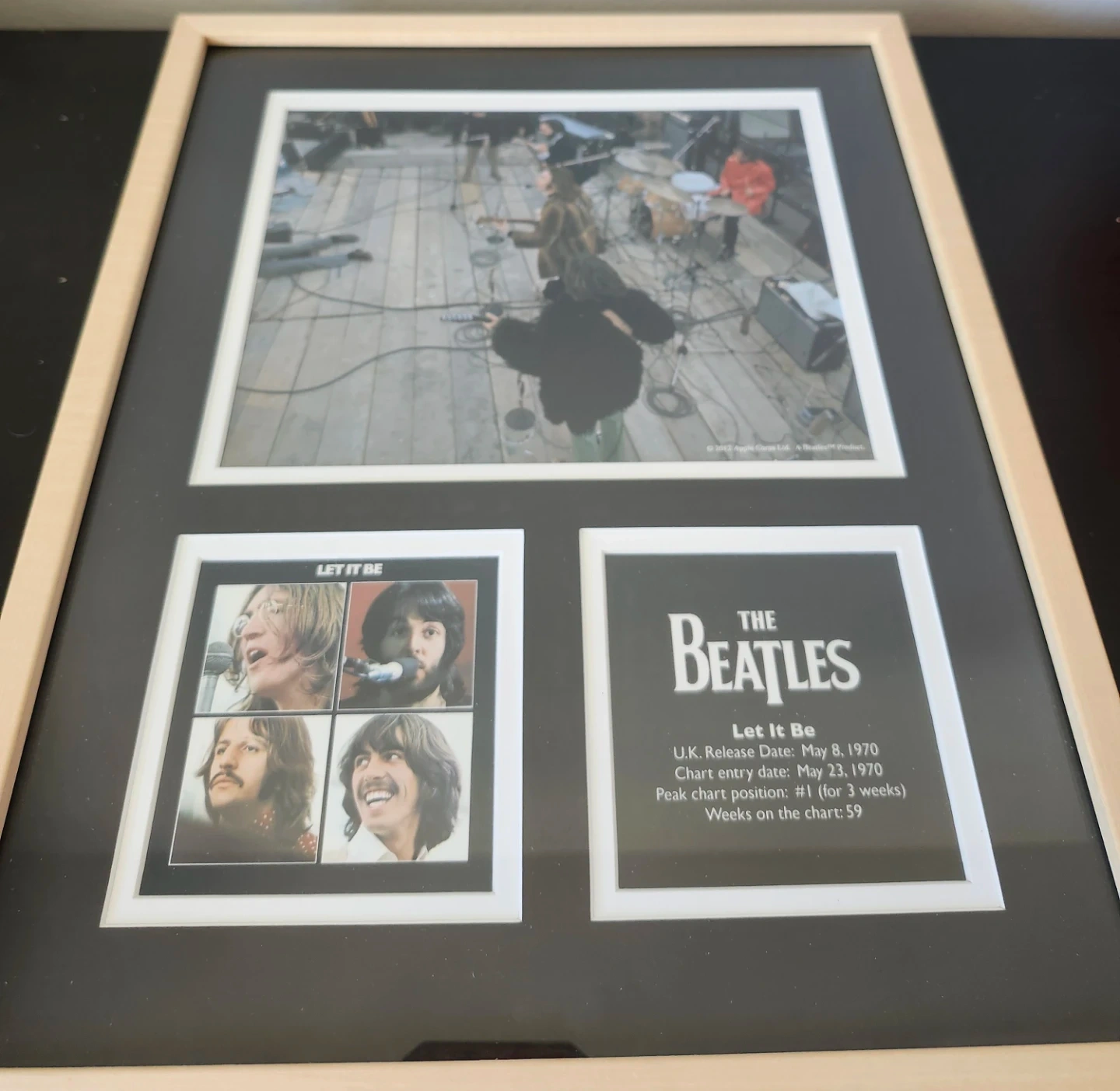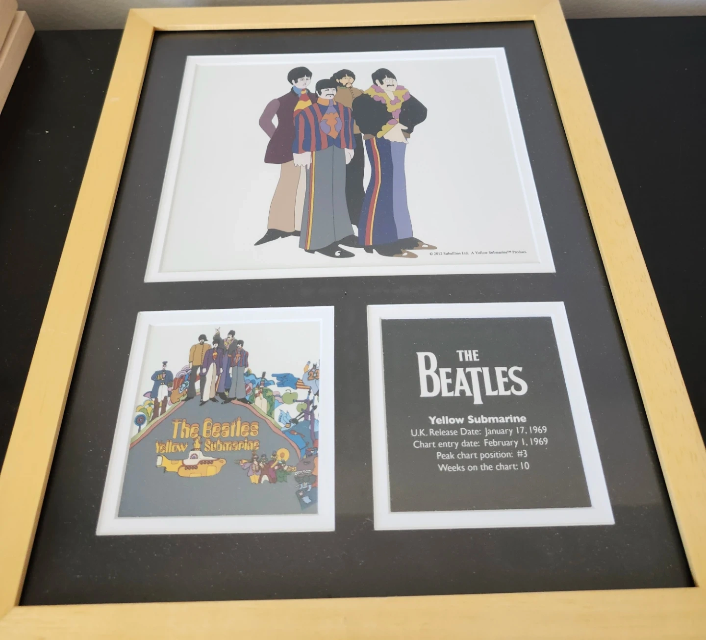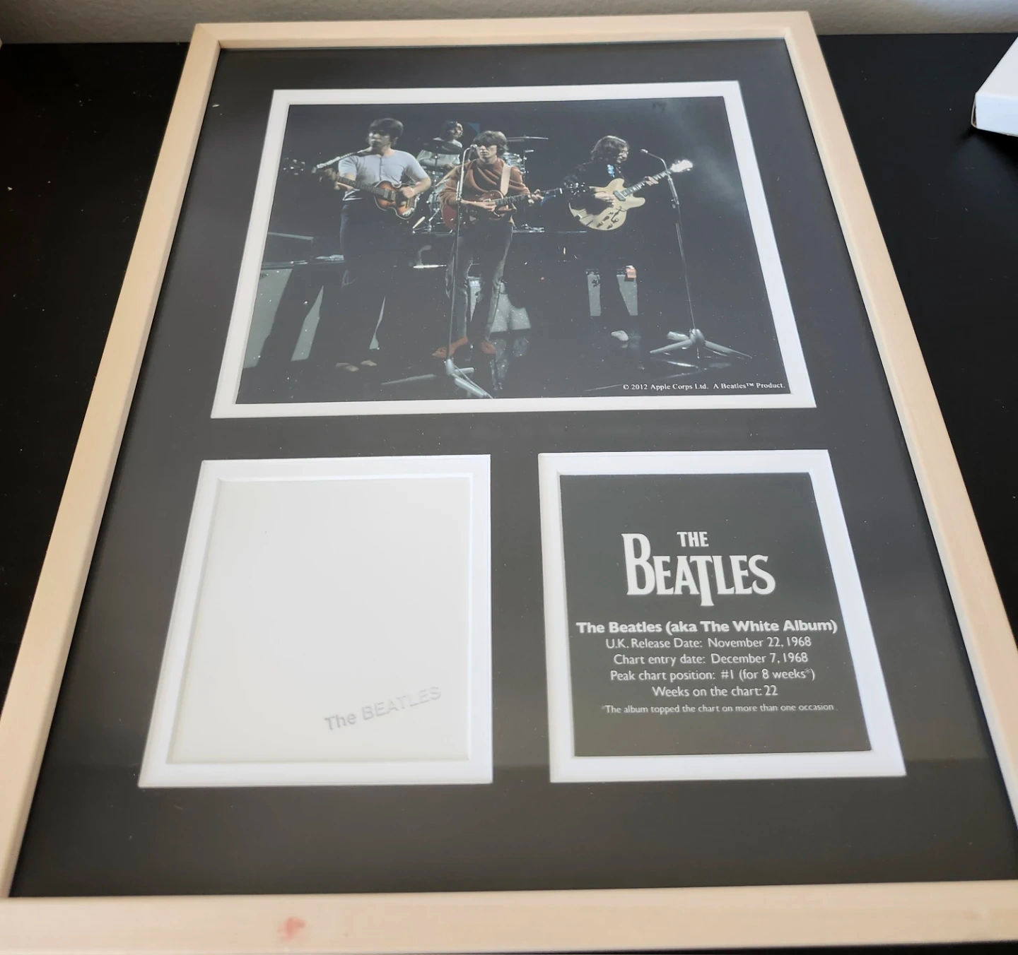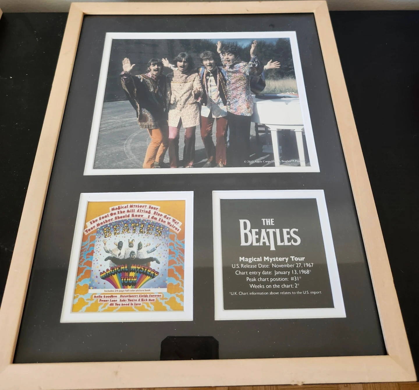 Framed collection of The Beatles album art. Includes Revolver, Sgt. Pepper's Lonely Hearts Club Band, Let It Be, The Beatles (aka The White Album), and Abbey Road.