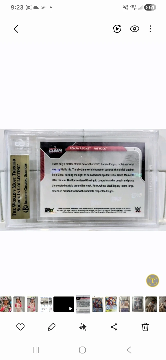 Selling a 2025 Topps Now WWE trading card featuring Roman Reigns and The Rock. The card is in pristine condition and has been graded a 10 by Beckett Grading Services (BGS). Corners are graded 10, centering 10, edges 10, and surface 9.5. A great addition to any wrestling fan's collection! Etransfer.