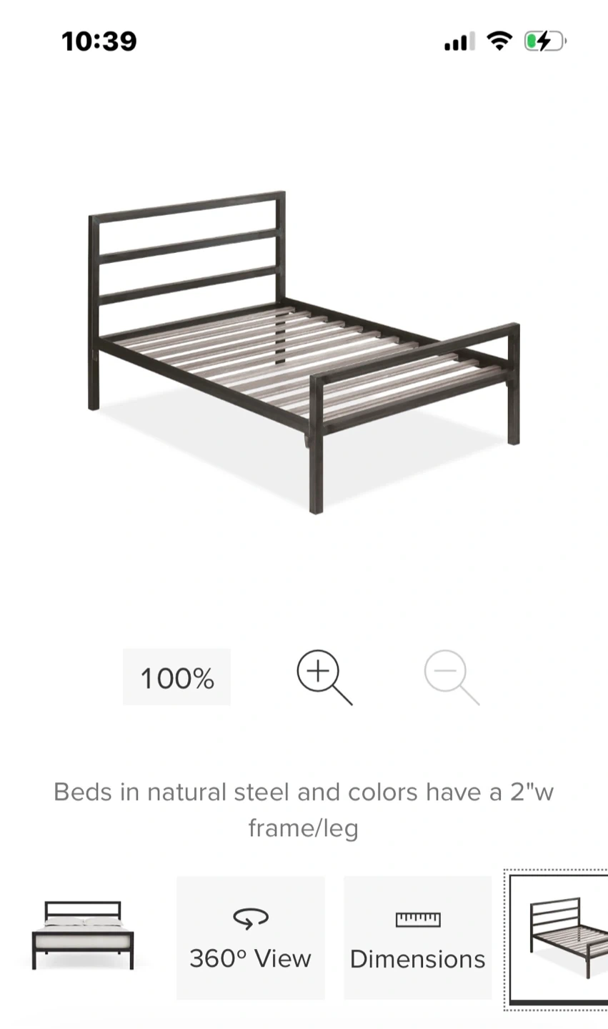 Selling a metal bed frame in natural steel. It has a 2" wide frame and legs. This bed frame would be a stylish addition to any bedroom!