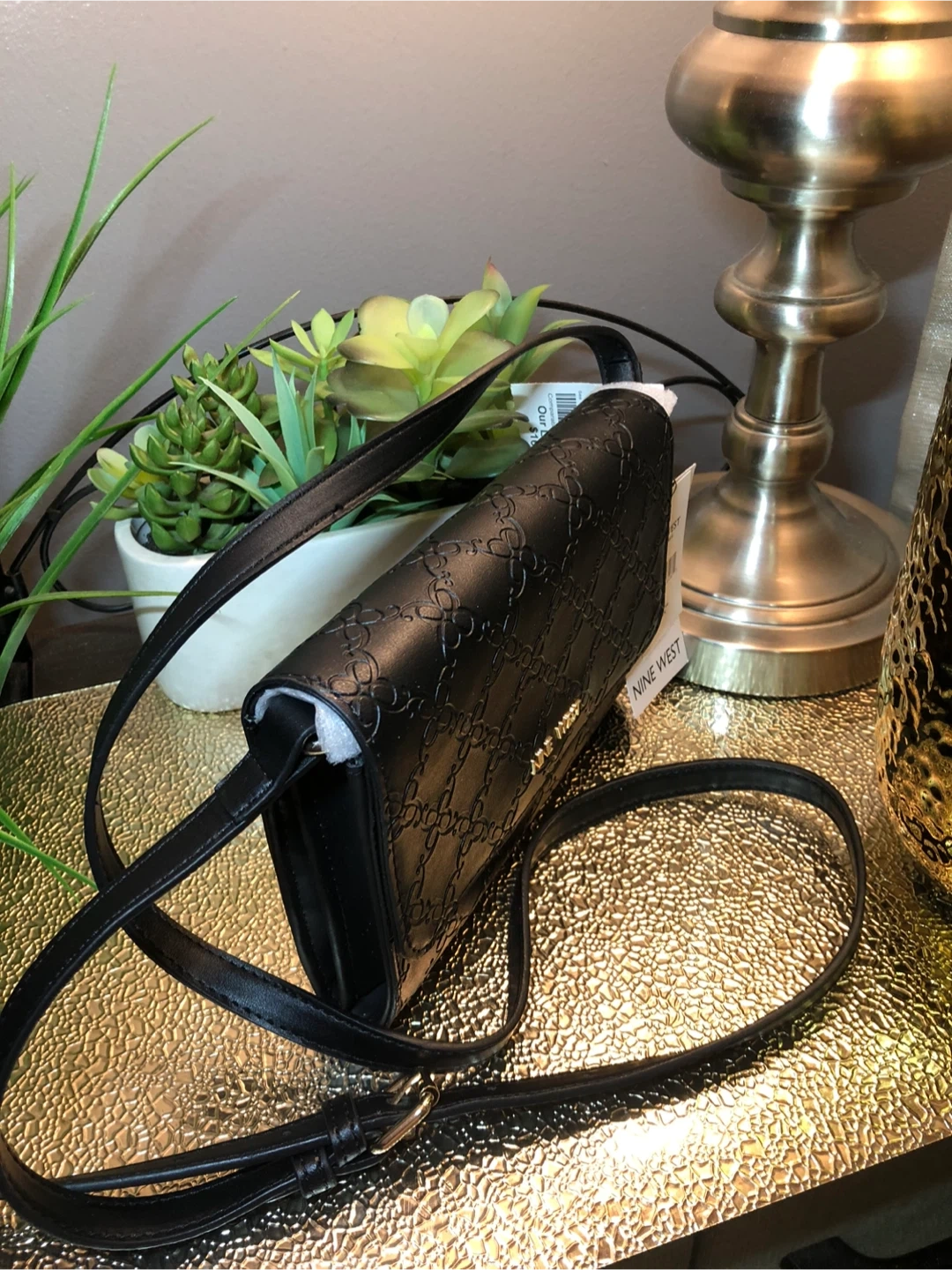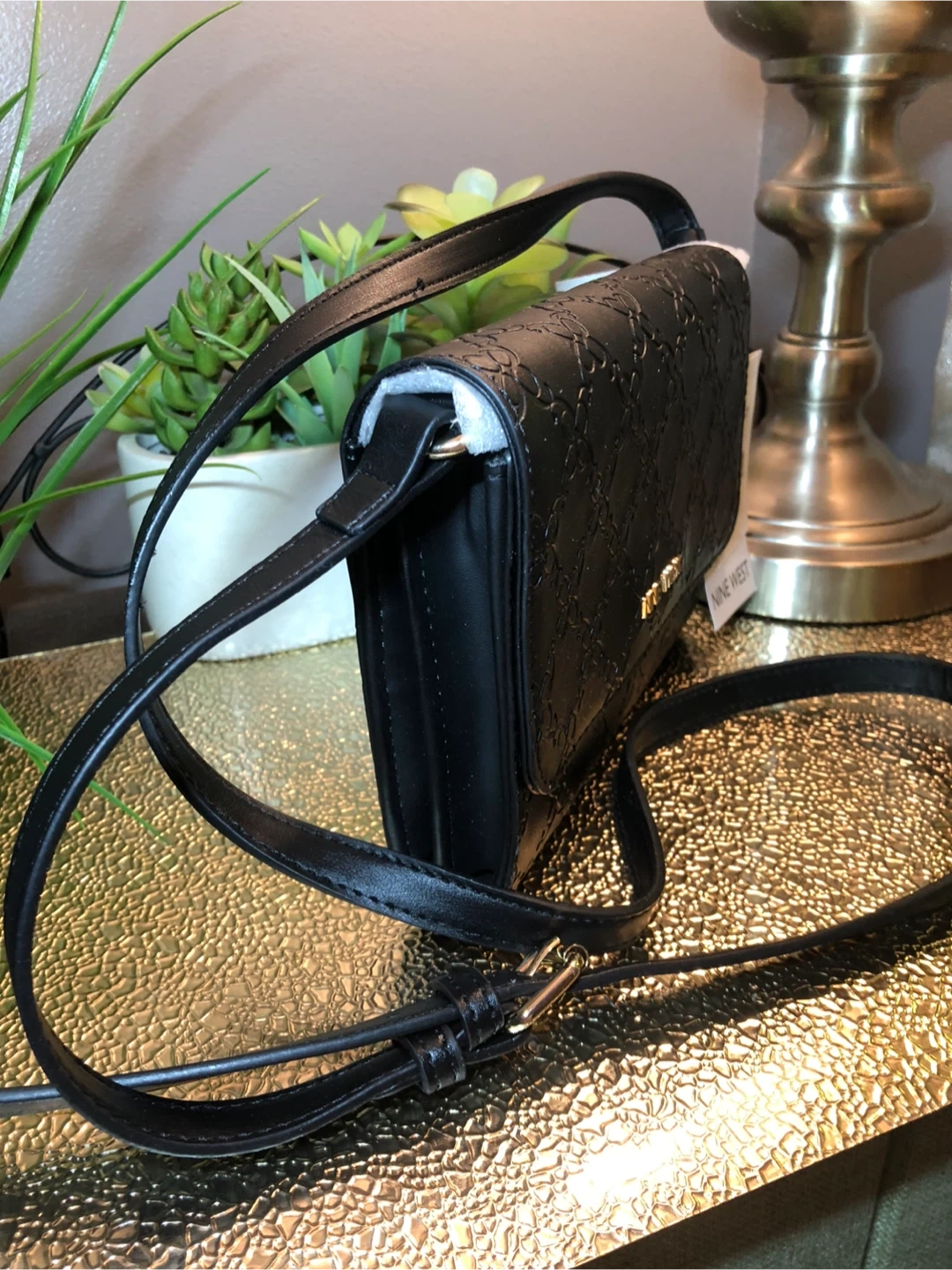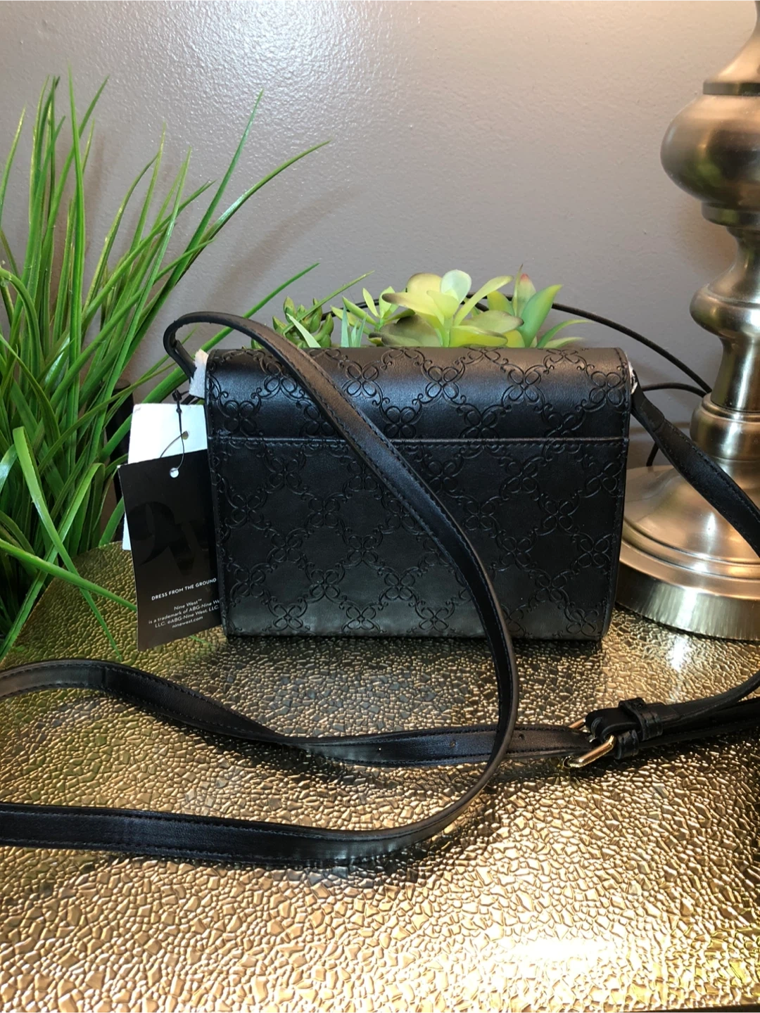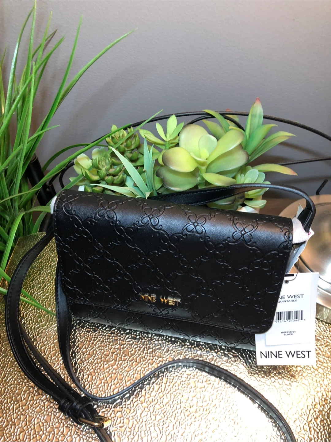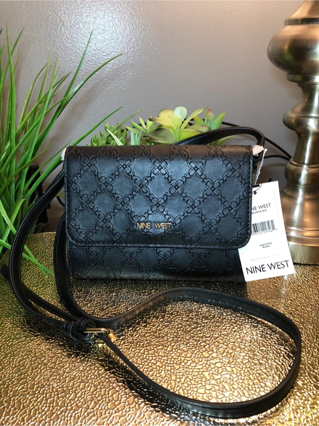 This is a Nine West crossbody bag in black. It features a stylish patterned design and a long, adjustable strap. The model number is NWST7754. Perfect for carrying your essentials in style!