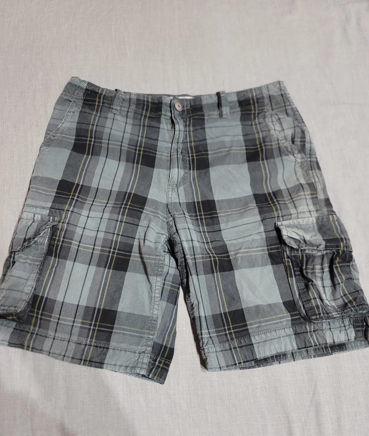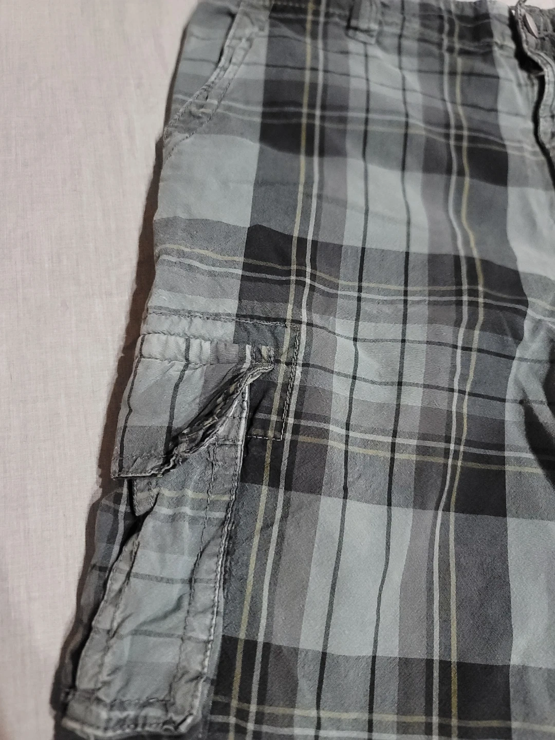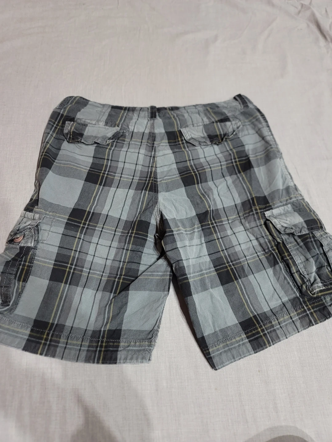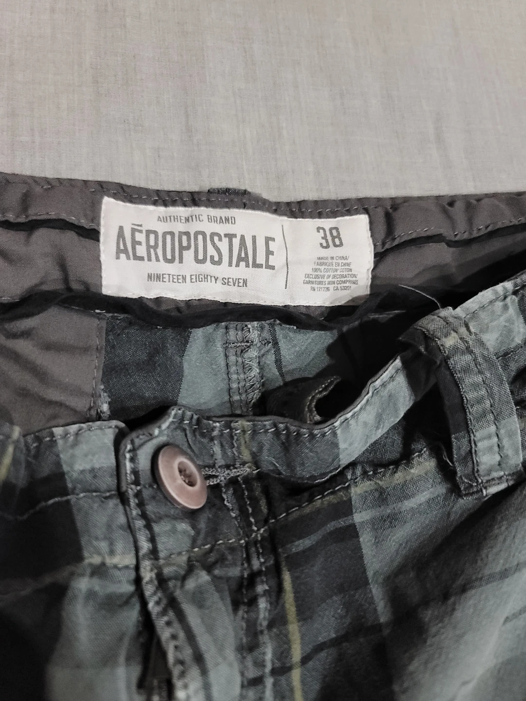 Selling a pair of Aeropostale cargo shorts in a gray plaid pattern. They are size 38 and made of 100% cotton. Perfect for casual wear!