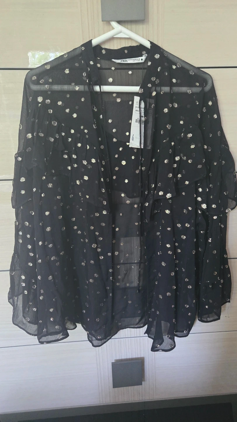 Selling a Zara blouse in size XS. It's black with a cute polka dot pattern. Perfect for dressing up or down! Oversized fit - can fit size medium
