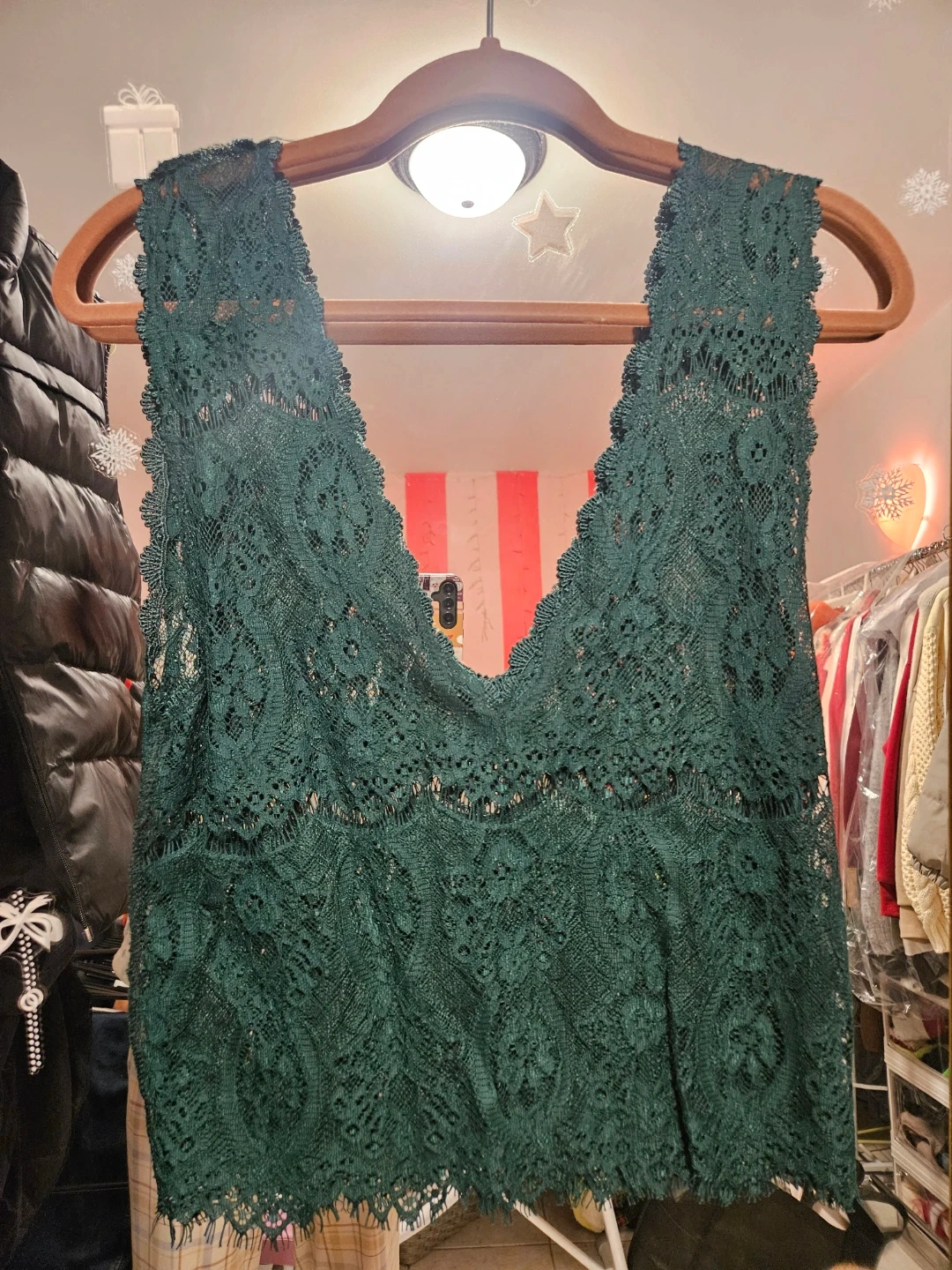 Selling a beautiful green lace top. It's in great condition and would be a wonderful addition to your wardrobe!