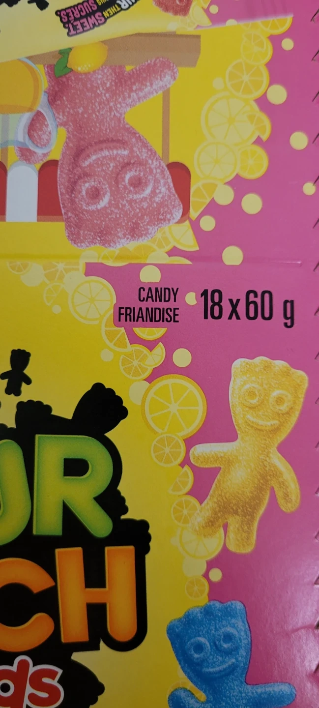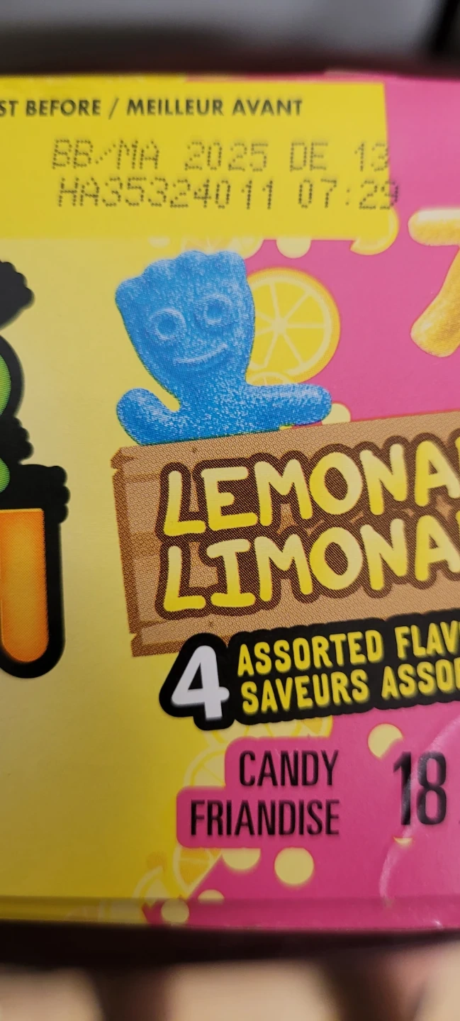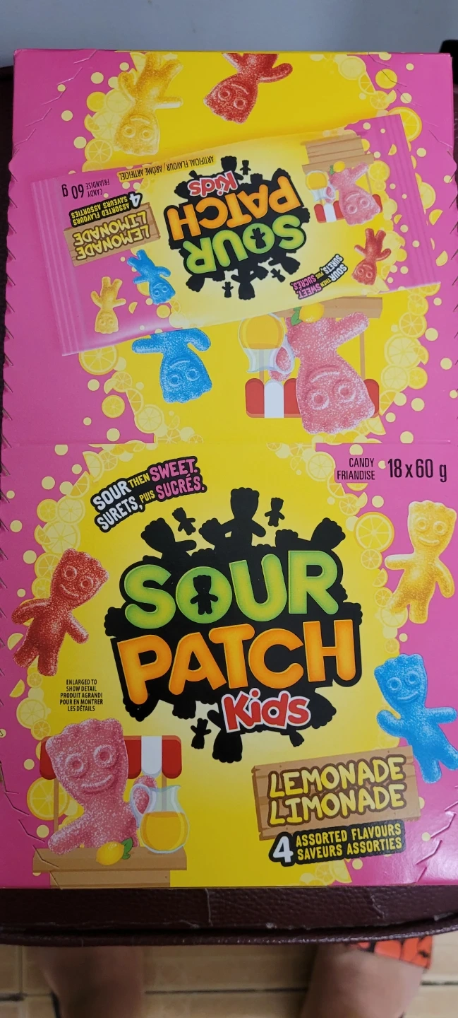 Selling a box of Sour Patch Kids Lemonade candy! This box contains 18 packs, each 60g. Enjoy the sour then sweet taste with 4 assorted lemonade flavours. The best before date is 2025 December 13