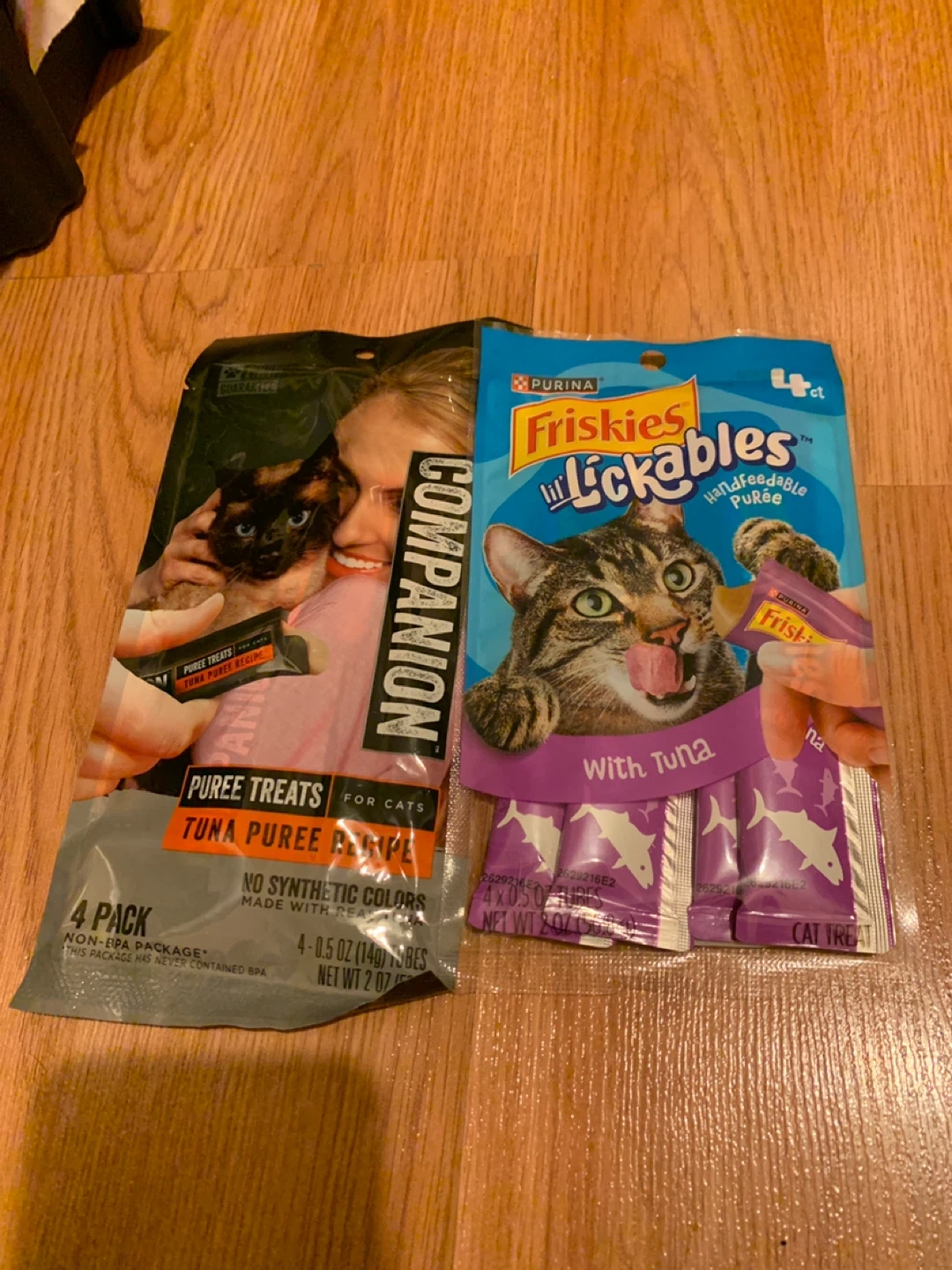 I have some cat treats for sale! There is a 4-pack of Companion Tuna Puree Treats and a 4-pack of Purina Friskies Lil' Lickables Handfeedable Puree with Tuna. Both are great for your feline friend!