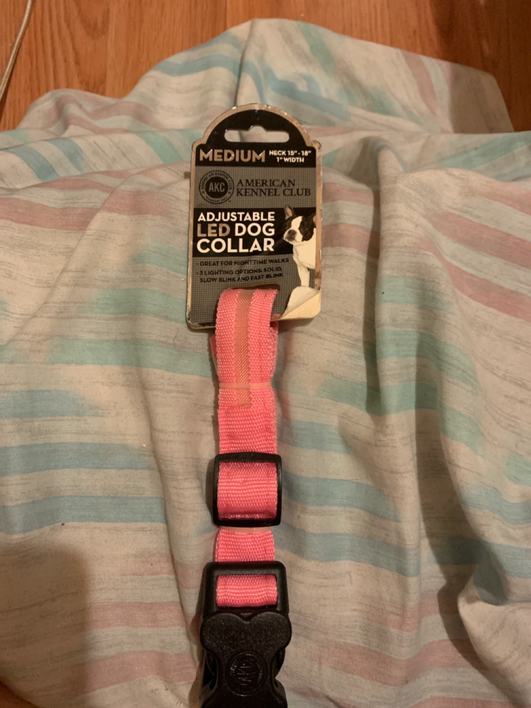 Selling a medium-sized adjustable LED dog collar from AKC American Kennel Club! It's great for nighttime walks, featuring 3 lighting options: solid, slow blink, and fast blink! The collar fits neck sizes 15"-18" and has a 1" width