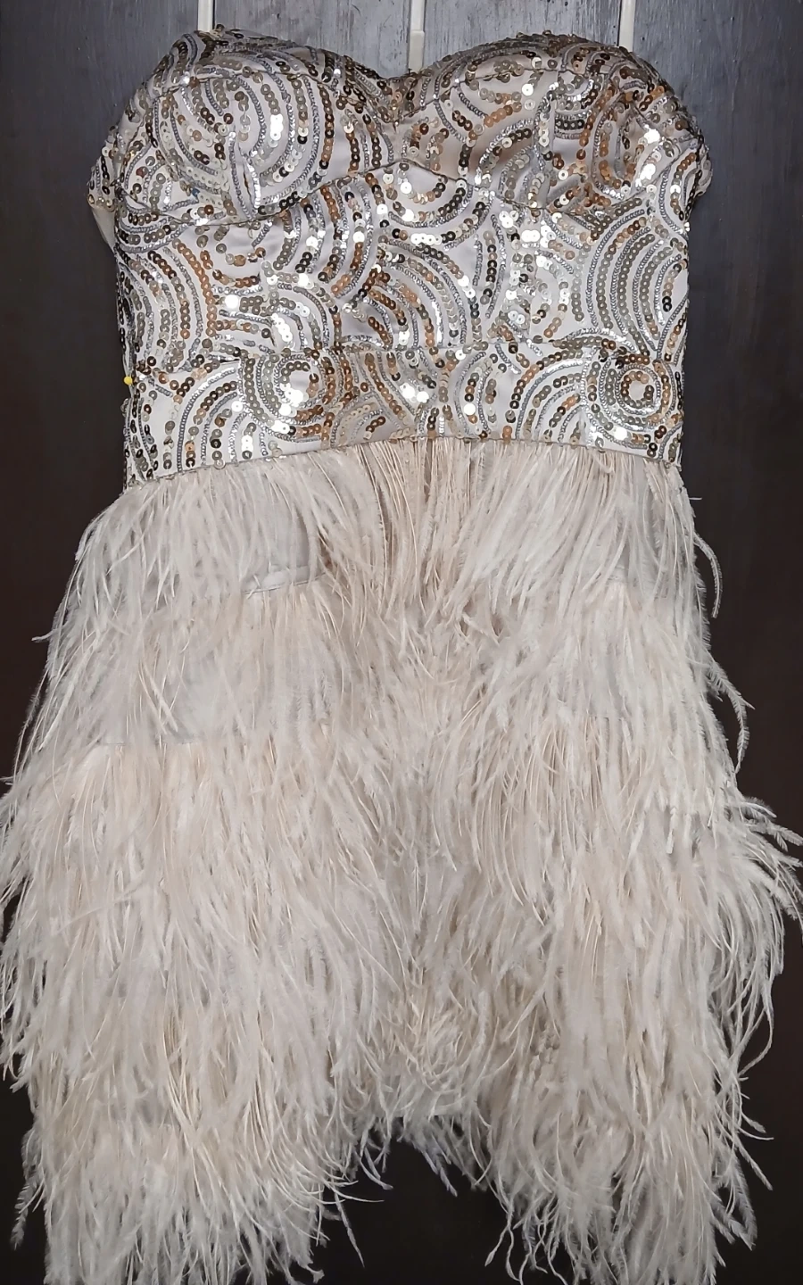 This is a fun and festive party dress! It features a sequined bodice and a feathered skirt. Perfect for a night out or a special occasion