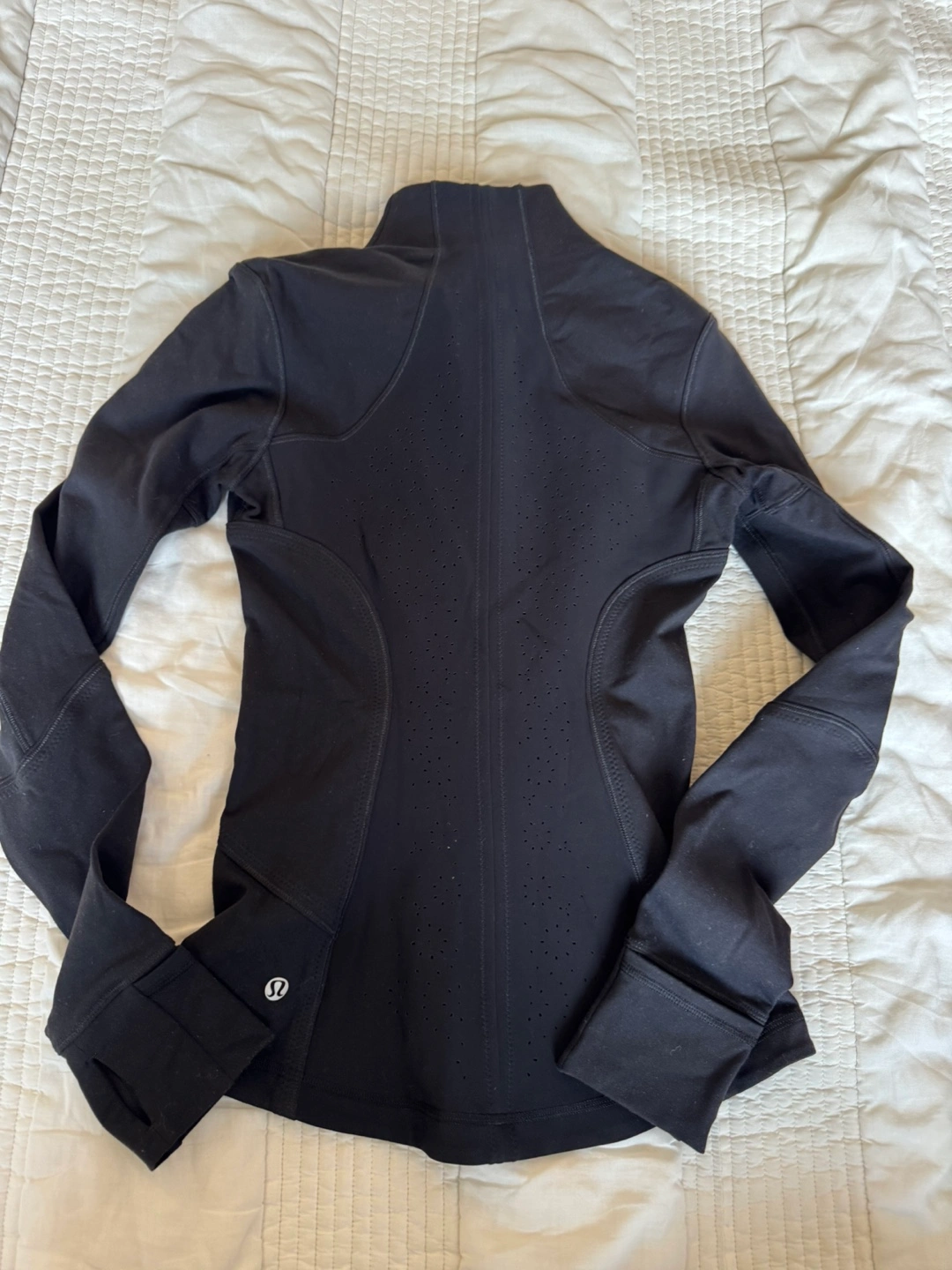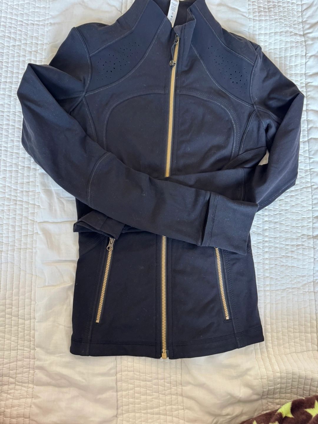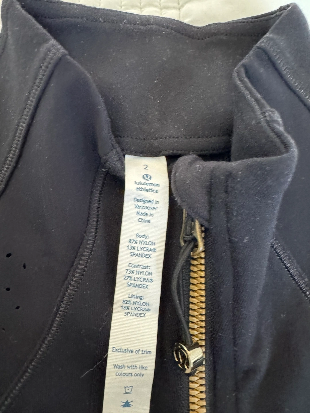 Selling a Lululemon Athletica jacket in size 2. The jacket is black and made of nylon, lycra, and spandex. It's in good condition and ready for a new owner!
