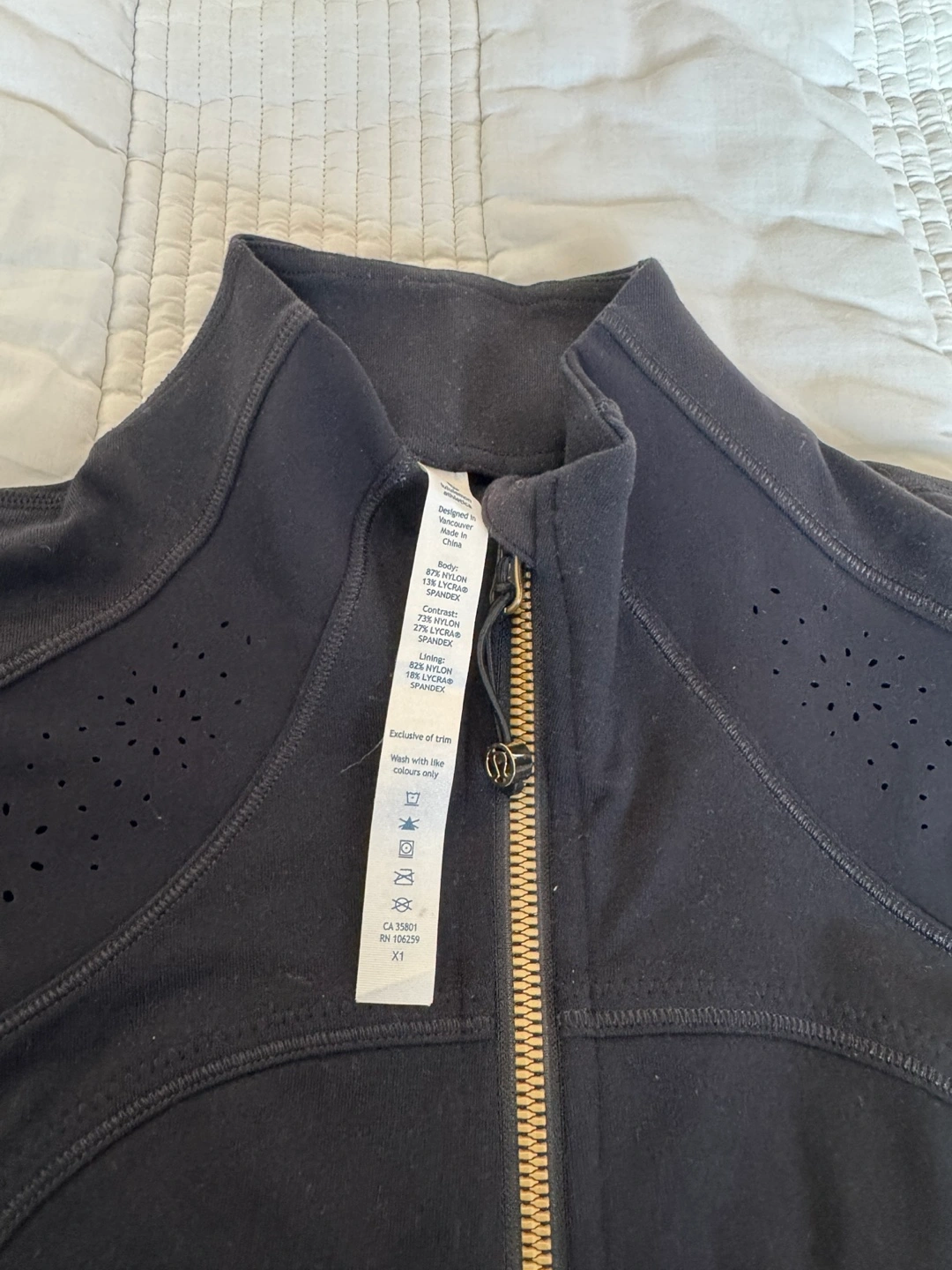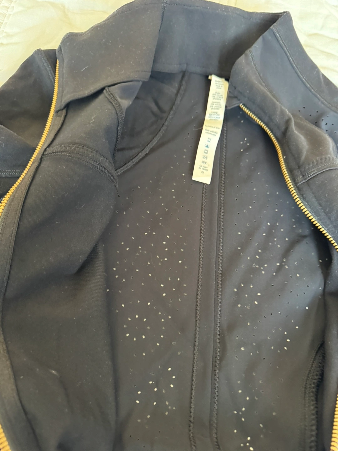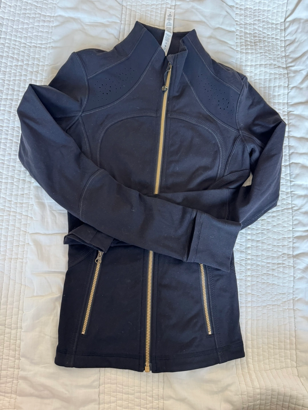 Selling a Lululemon Athletica jacket in size 2. The jacket is black and made of nylon, lycra, and spandex. It's in good condition and ready for a new owner!