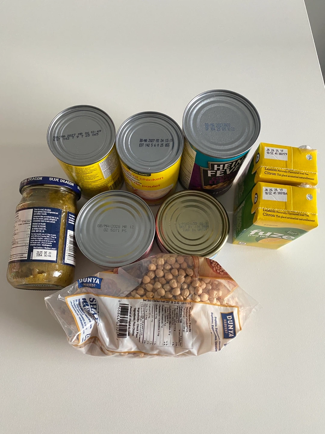 Variety of canned goods, including beans, tuna, soup, and chickpeas. Perfect for stocking up your pantry! Best before dates in second picture.