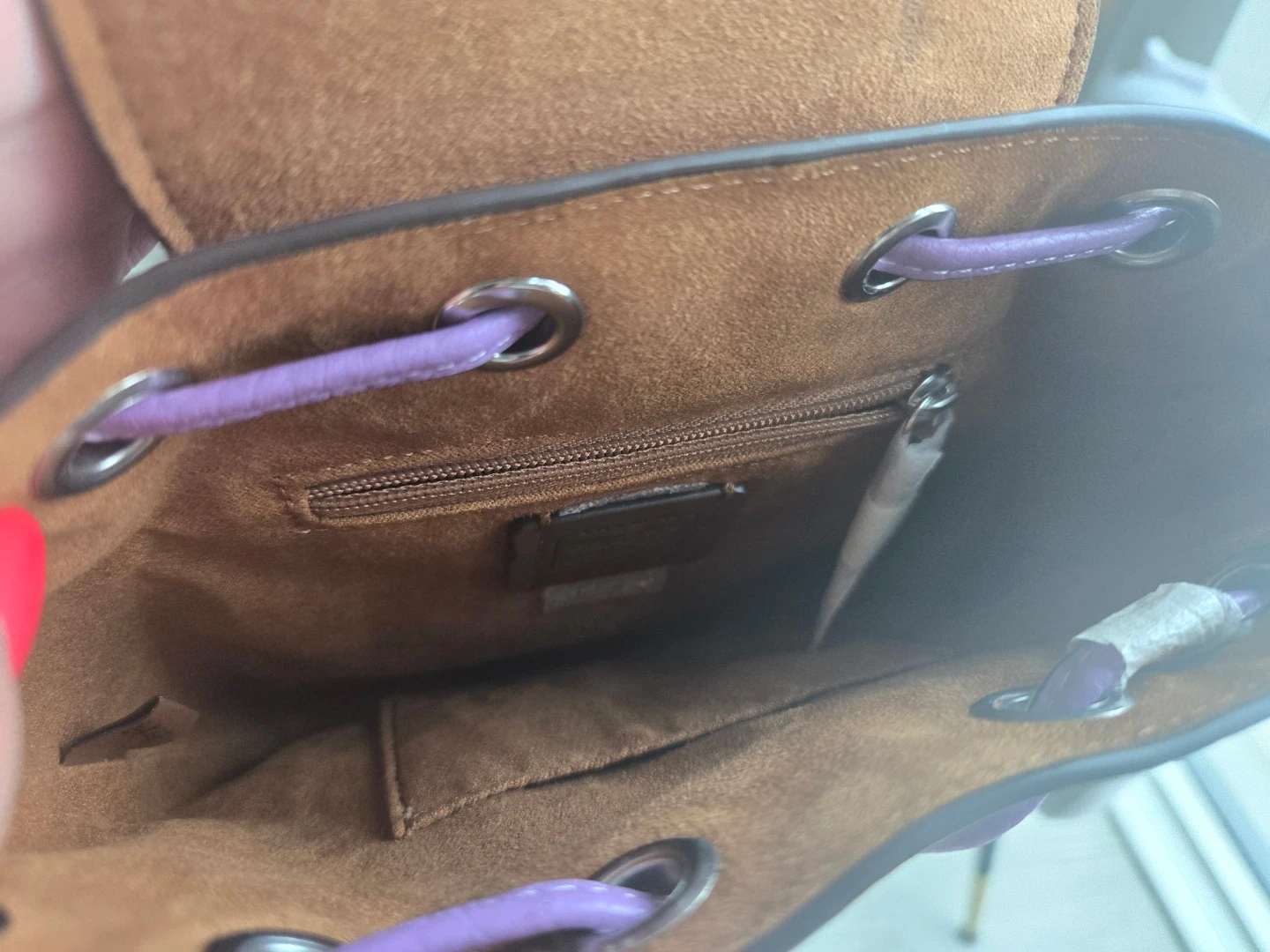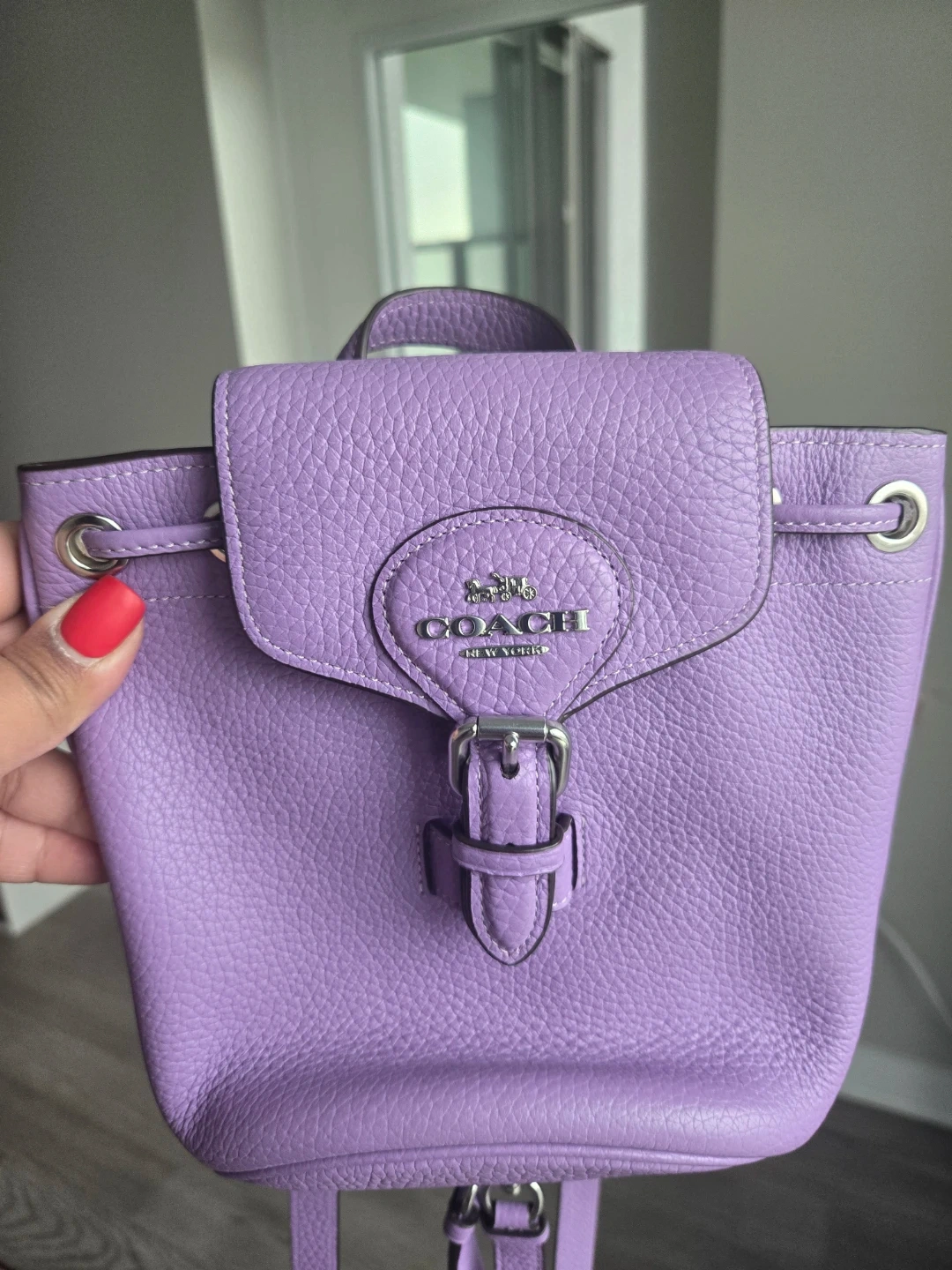 This is a cute Coach mini backpack in a lovely shade of purple! It's made of leather and features a drawstring closure and a buckle on the front. The interior is brown and has a small zippered pocket. Perfect for carrying your essentials!