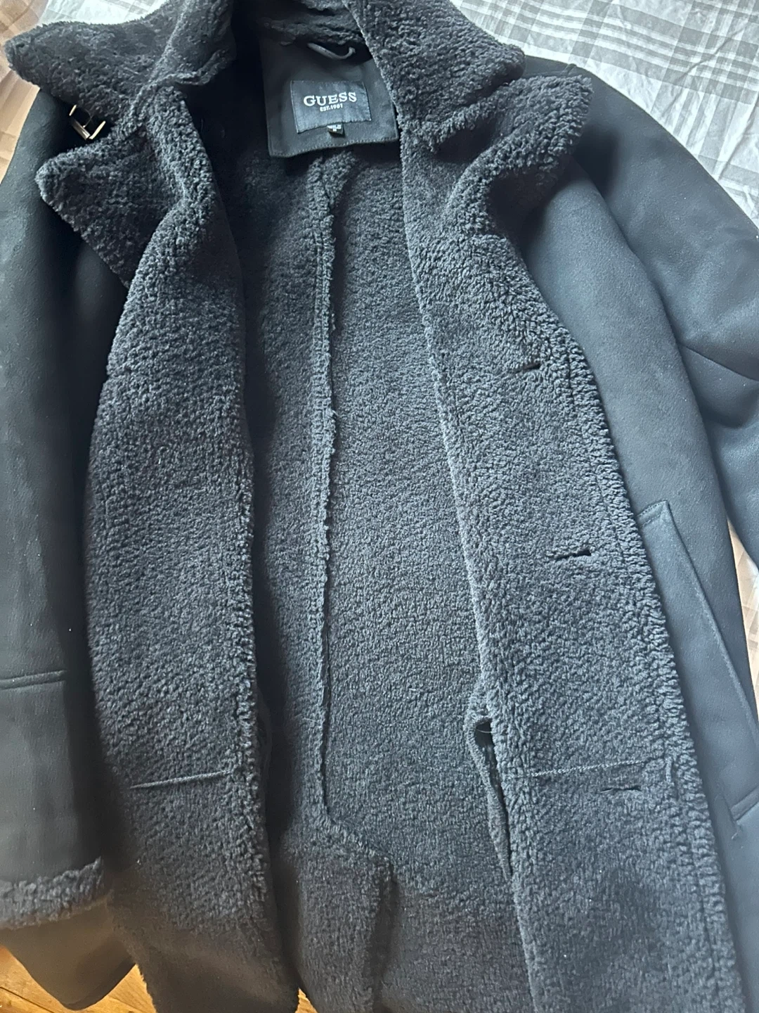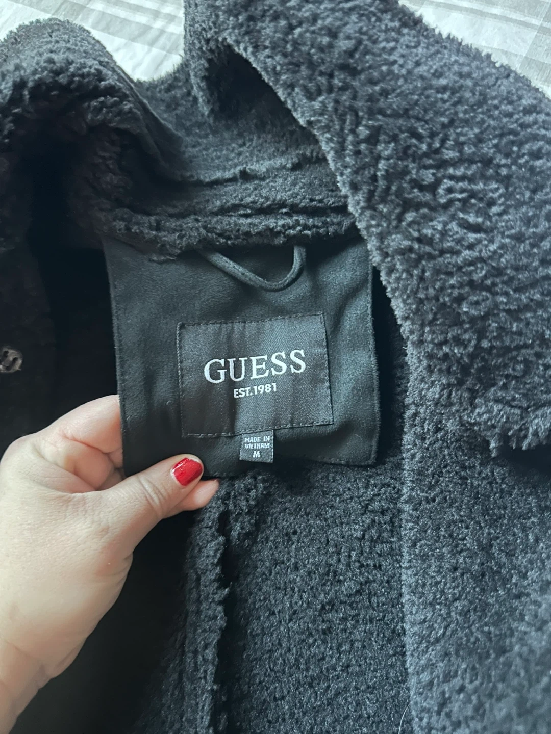 Cozy Guess coat in a stylish black faux shearling! This coat is a size medium and perfect for keeping warm and looking great during cooler weather. The material is soft and comfortable, making it a great addition to your wardrobe