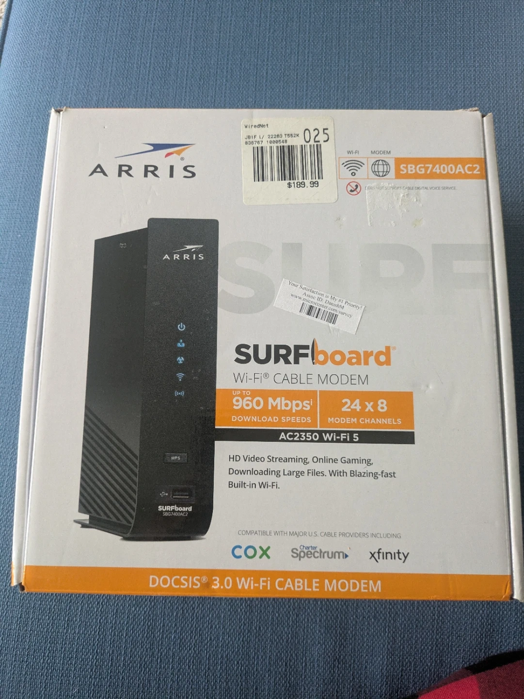 Selling an Arris SURFboard SBG7400AC2 Wi-Fi cable modem. It's compatible with major U.S. providers including Cox, Spectrum, and Xfinity. The modem supports DOCSIS 3.0 and provides download speeds up to 960 Mbps. It also features AC2350 Wi-Fi 5 for HD video streaming and online gaming. Originally bought for $189.99