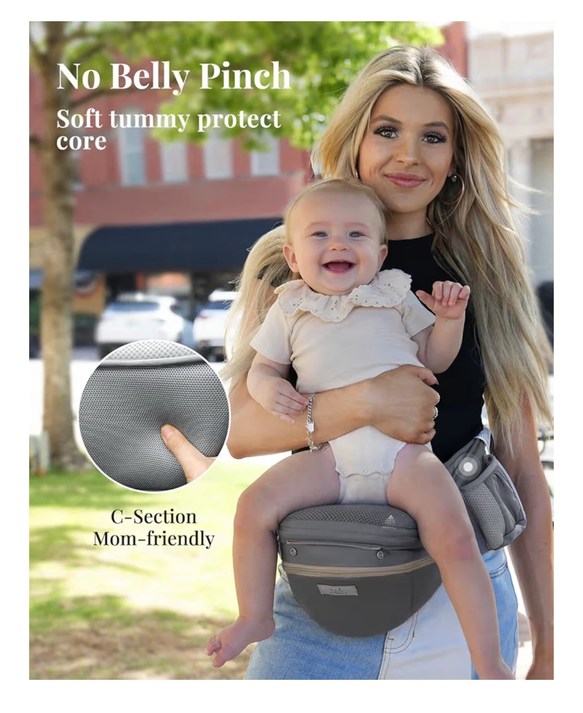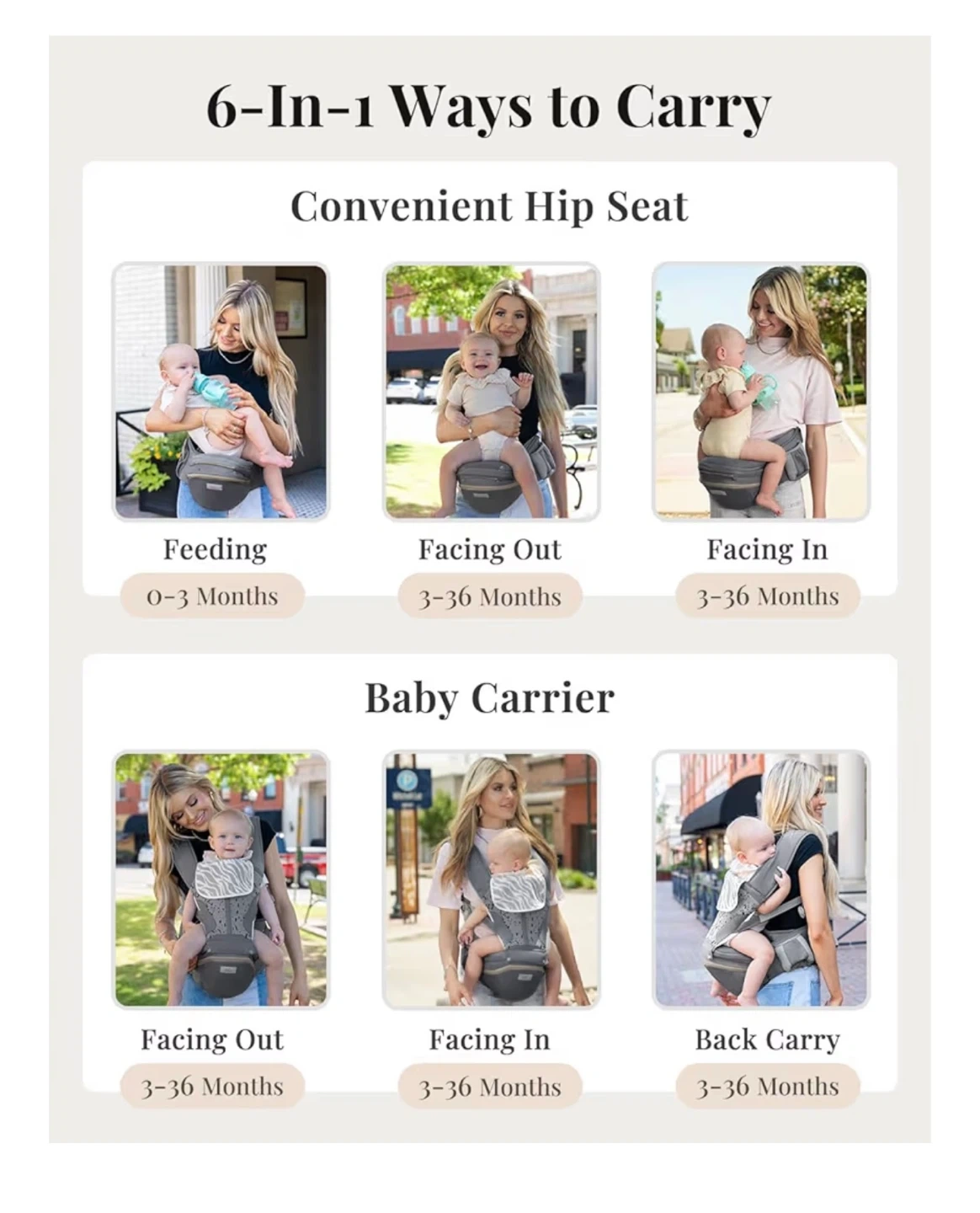 This is a versatile 6-in-1 baby carrier with a convenient hip seat. It's designed for multiple carrying positions like feeding, facing out, and facing in. The carrier is suitable for babies from 0-36 months, offering a soft tummy protect core and C-section mom-friendly design.