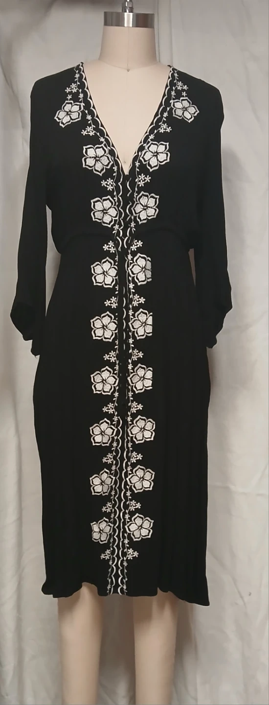 This is a black dress with beautiful white floral embroidery down the front. It's in great condition and ready for a new owner!