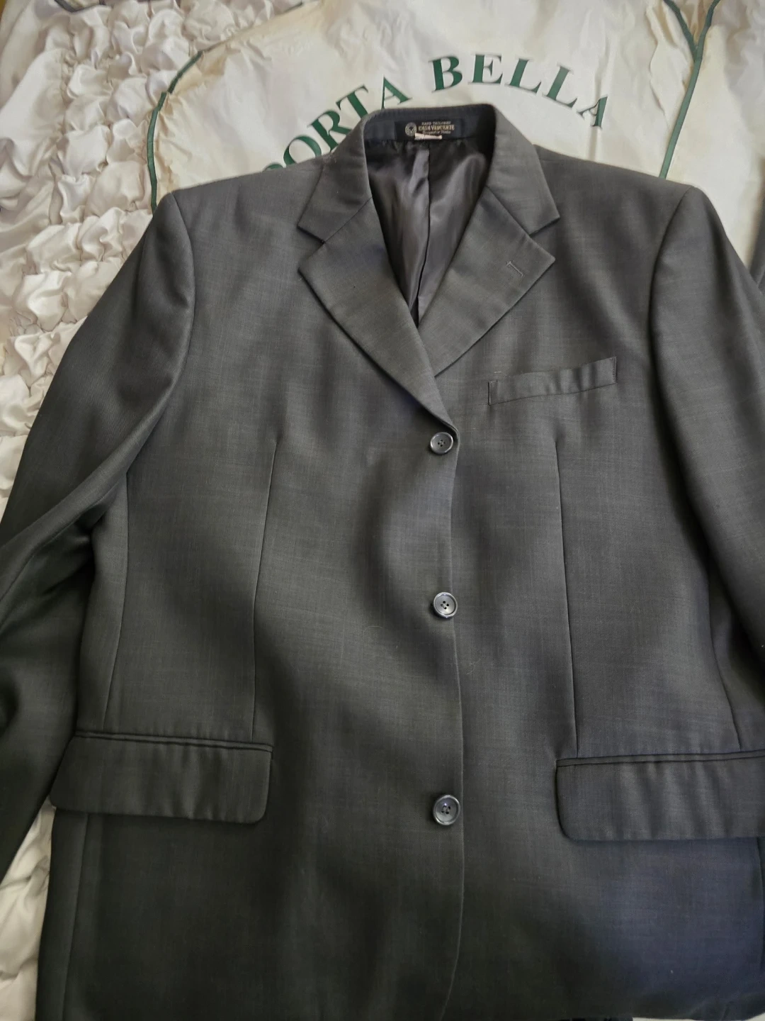 Selling a Porta Bella suit in a stylish gray color. It's in great condition and ready for a new owner. Perfect for any occasion!
