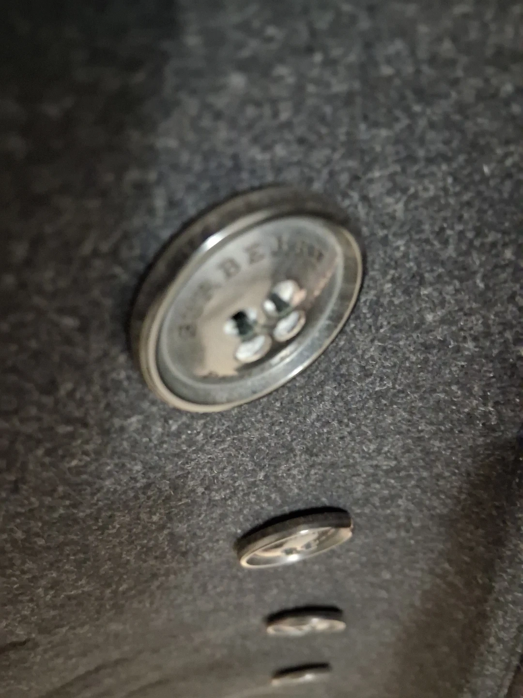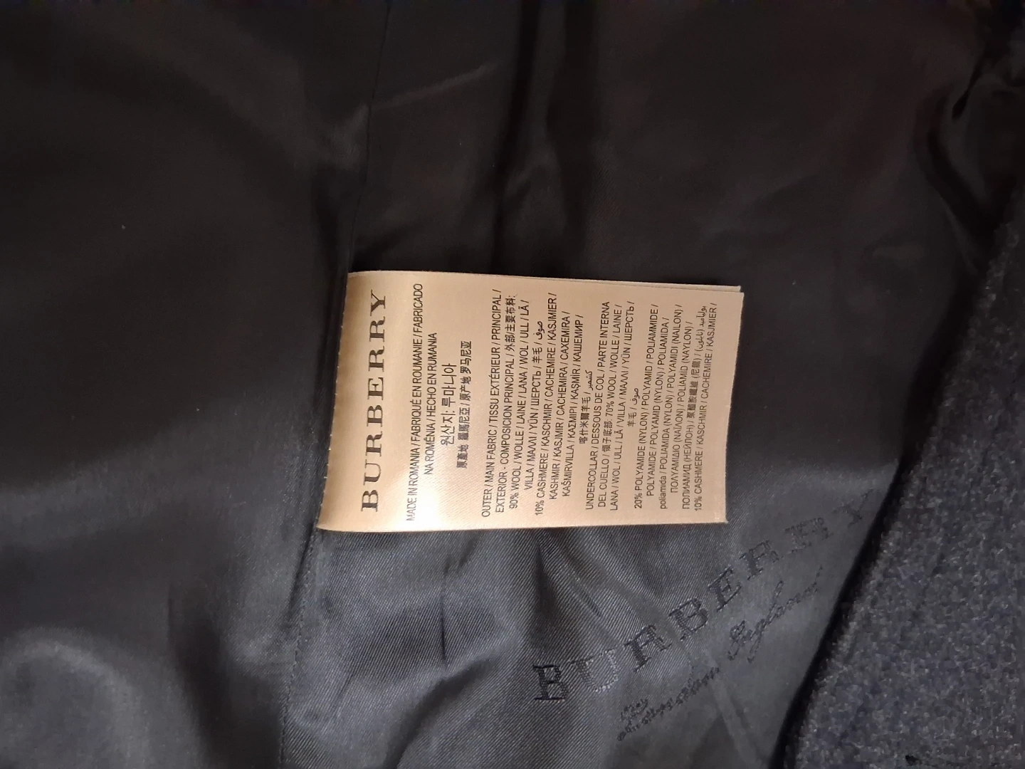 Here's a stylish Burberry London England coat in size 50! It's a wool blend, perfect for keeping warm and looking sharp. The coat features a classic double-breasted design with button detailing and a sleek grey colour. It's in great condition and ready for a new owner!