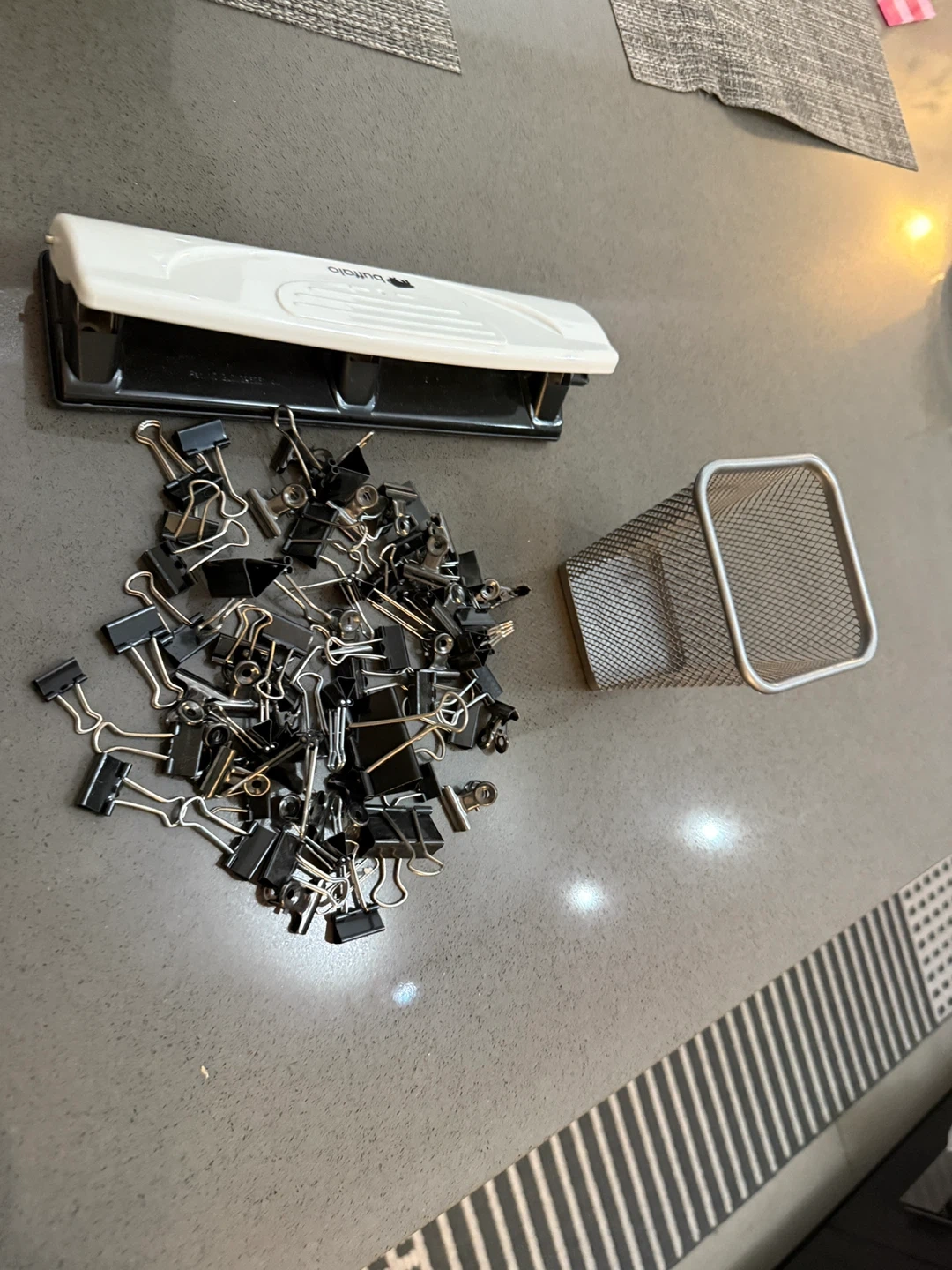 I'm selling a Buffalo hole punch, a bunch of binder clips, and a metal pen holder. They're all in good condition and ready for a new home office!