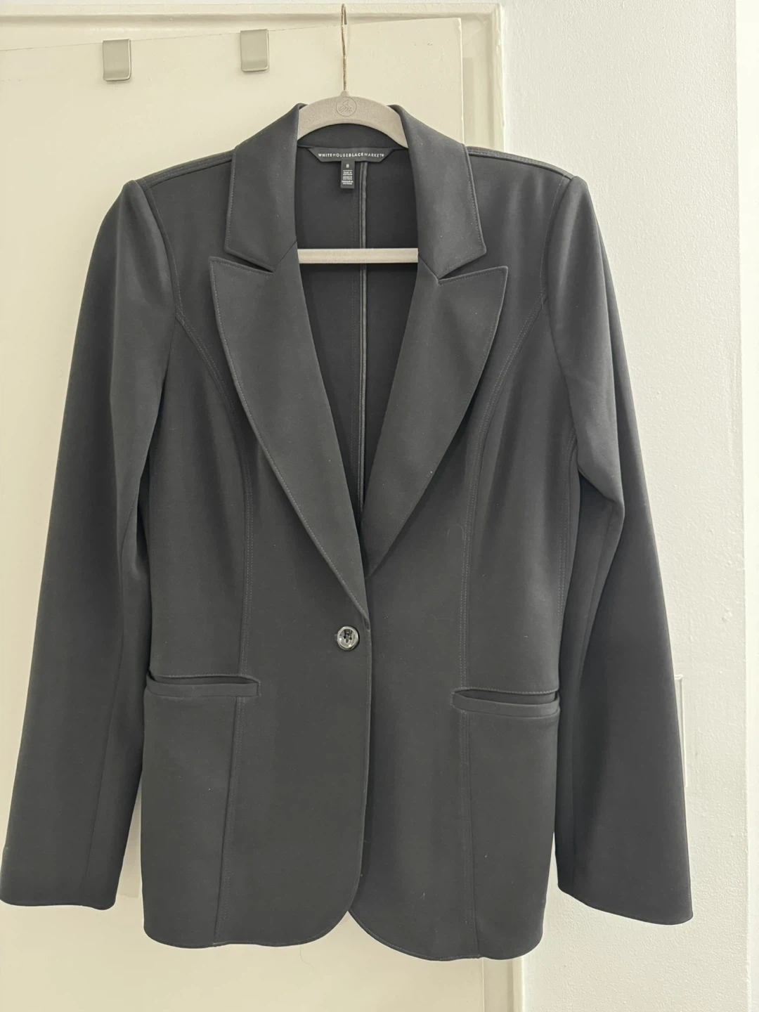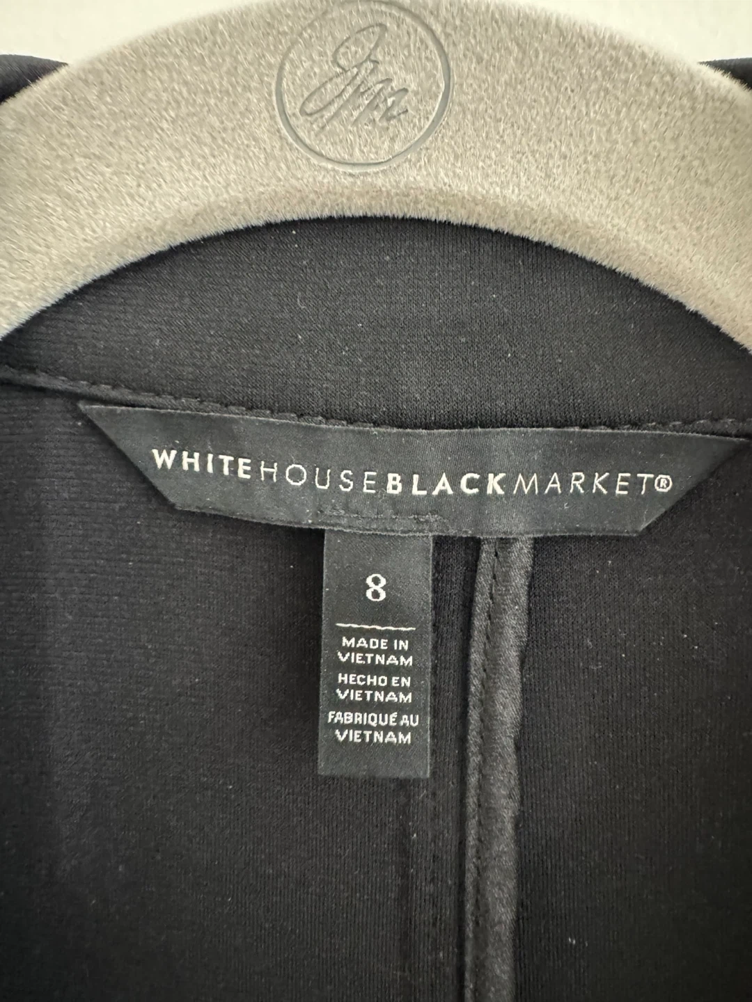 Selling a gently used blazer from White House Black Market in size 8. It's a classic black colour and made of 95% polyester and 5% spandex. Perfect for adding a touch of sophistication to any outfit!