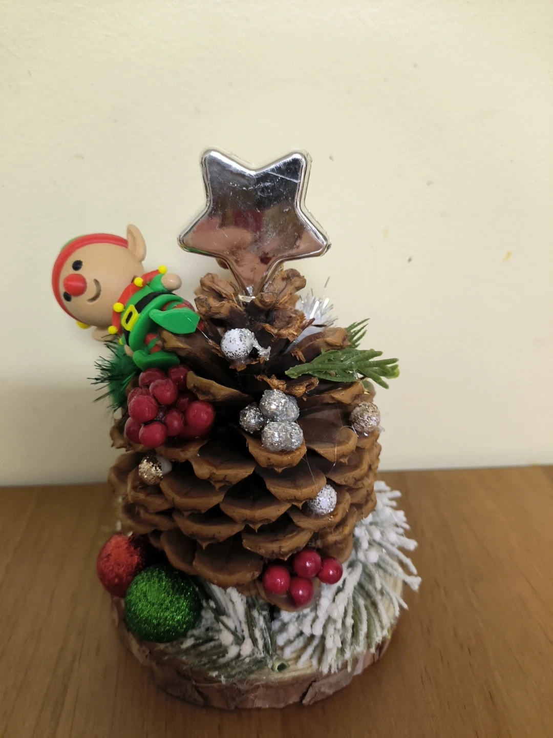 This is a cute little pinecone Christmas tree decoration! It has a silver star on top and an elf on the side. It's perfect for adding a touch of holiday cheer to your home