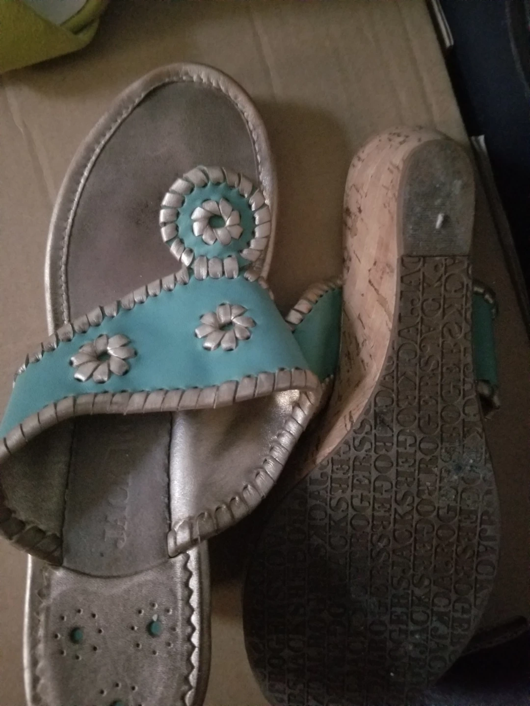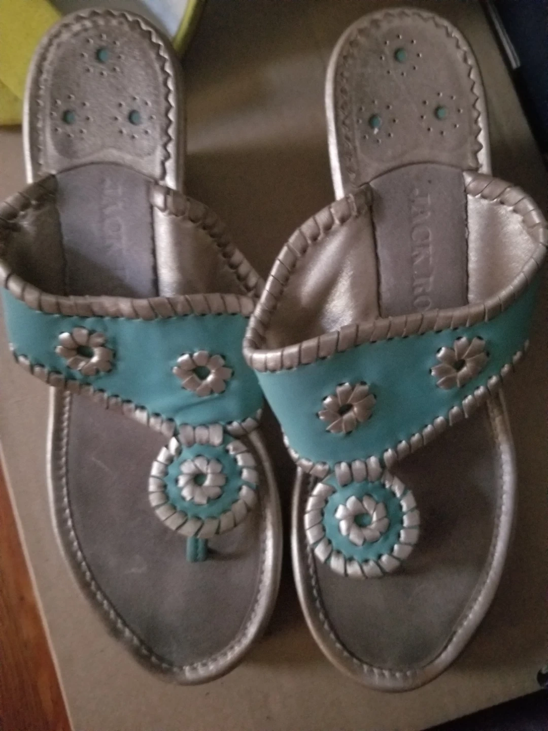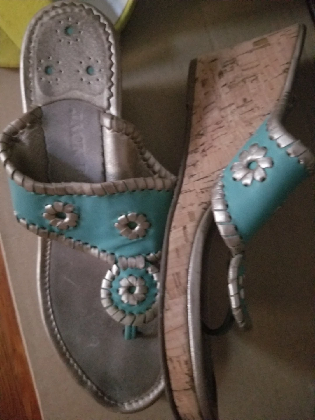 Selling a pair of Jack Rogers sandals in a size 6. They feature a beautiful turquoise and silver color scheme and have a slight wedge heel.