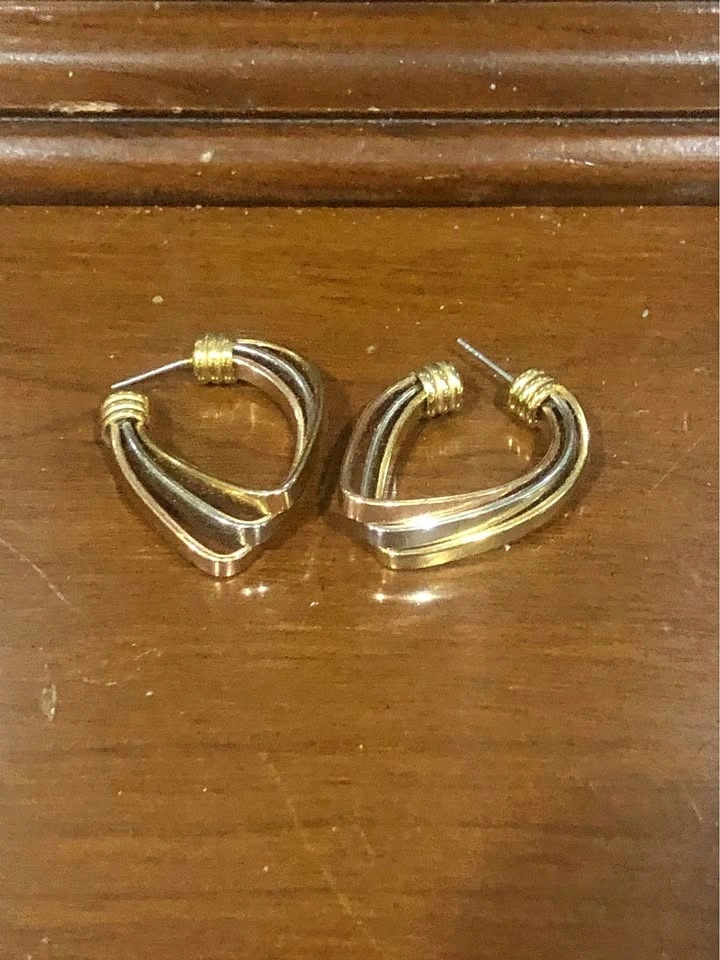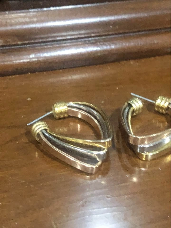 These tri-tone earrings are in excellent condition as they haven’t seen much use. They have the tones woven together in a way that doesn’t clash, and is classy especially when they catch the light.