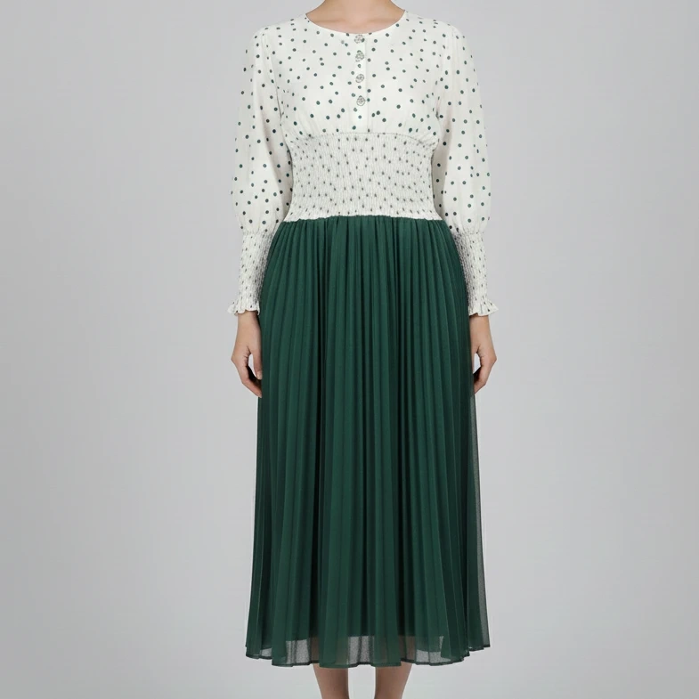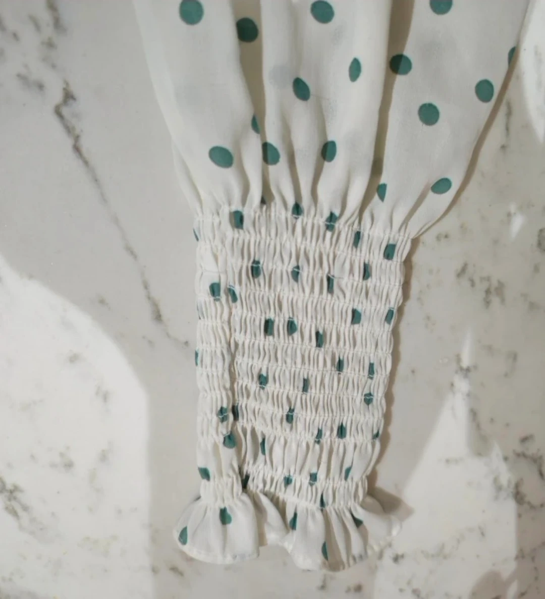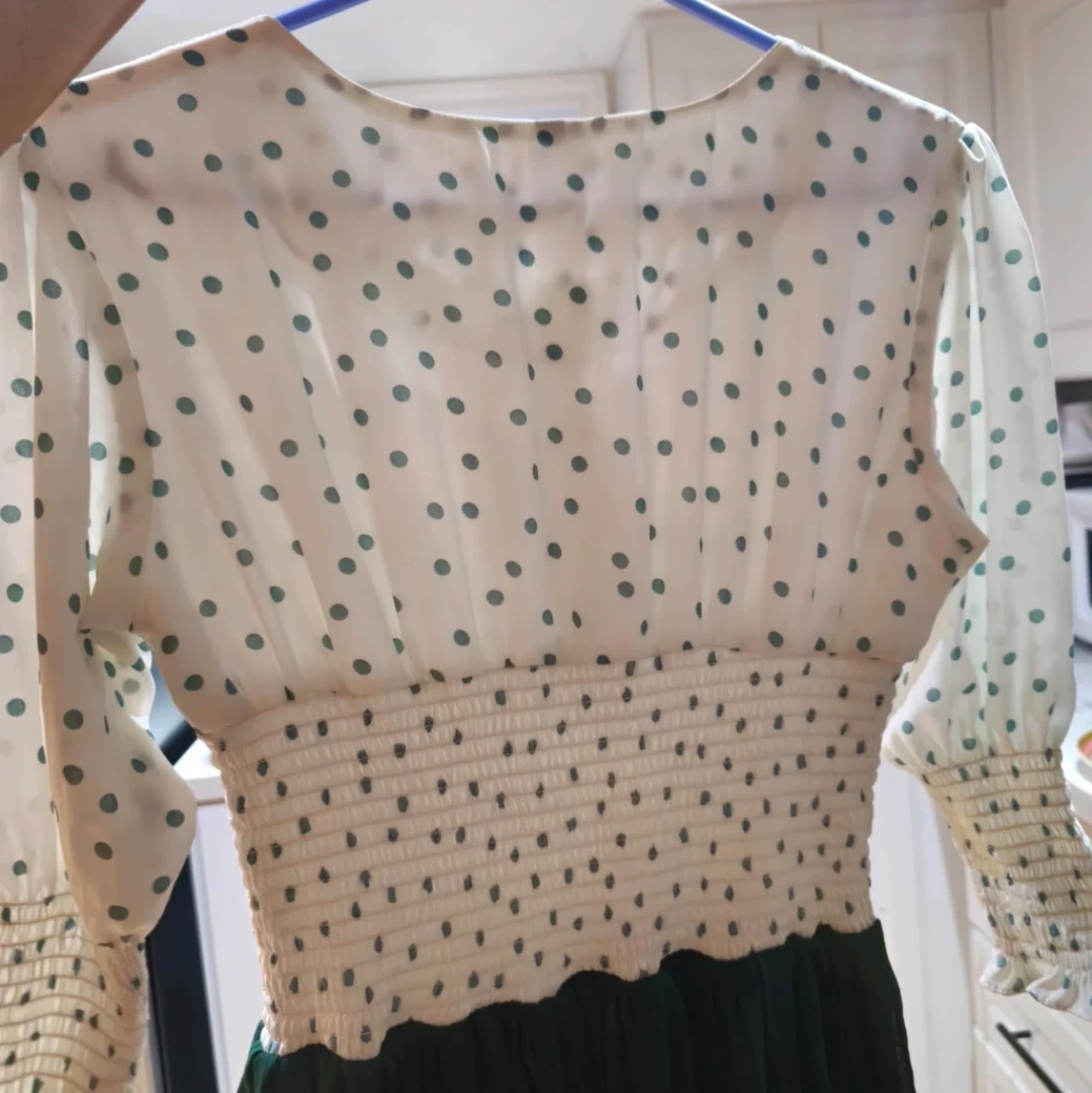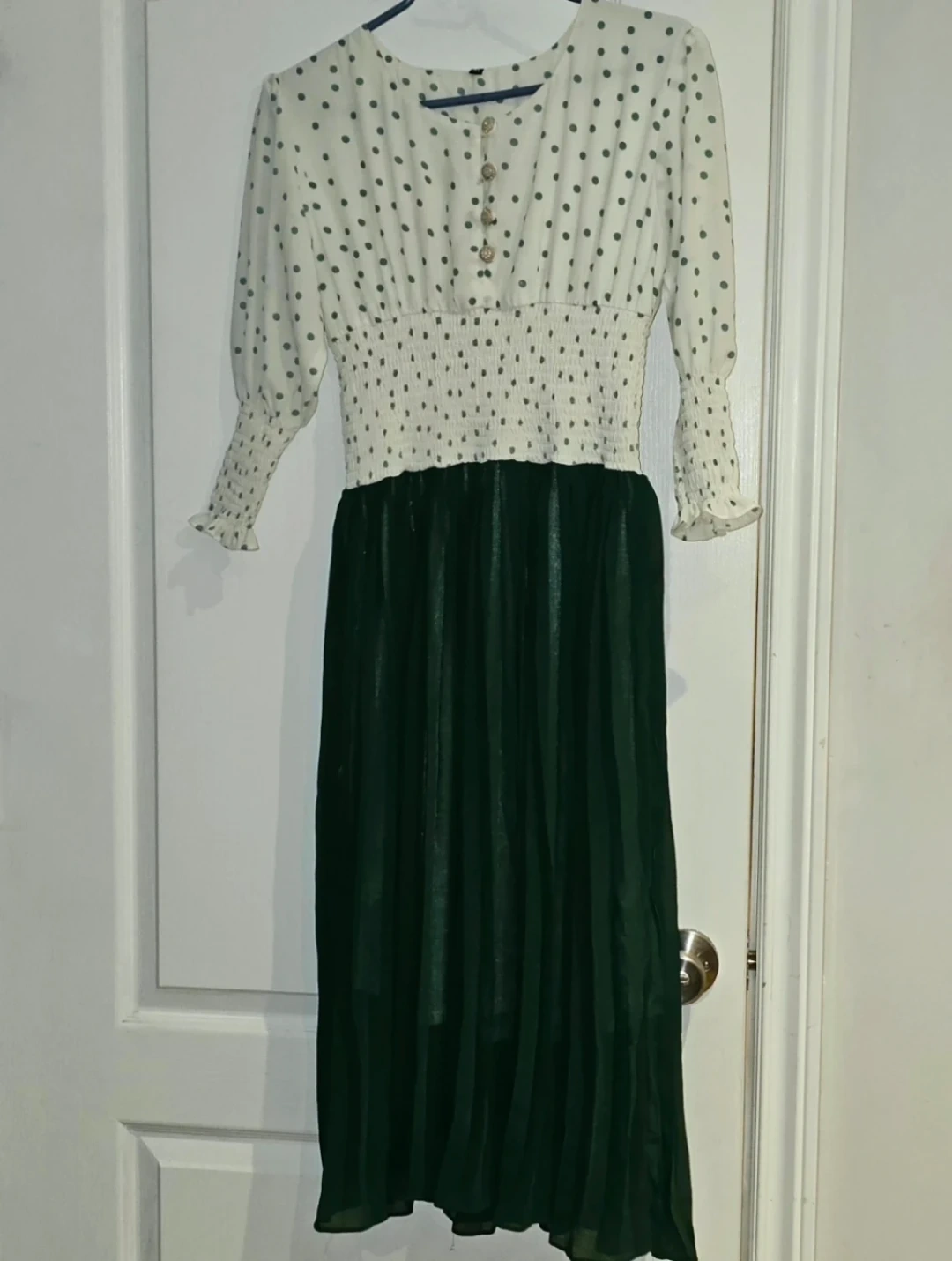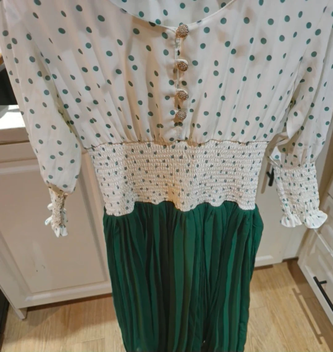 This is a white and bottle green polka dot dress with a shirred waist and decorative buttons. Extremely pretty in person!! Got it for $35+ but never got to wear, so added a reference picture.