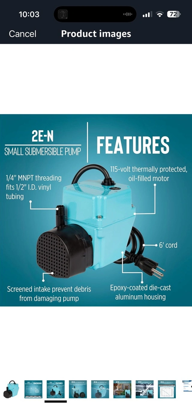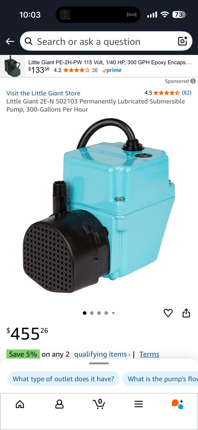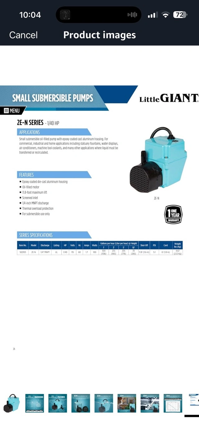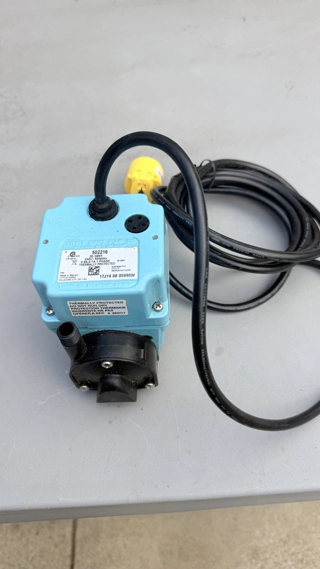 This Little Giant 2E-N 502103 is a permanently lubricated submersible pump, perfect for various applications requiring liquid transfer. It features a 1/4-inch MNPT discharge, a 1/40 HP motor, and an epoxy-coated die-cast aluminum housing. This pump has been previously used but remains in good working condition.