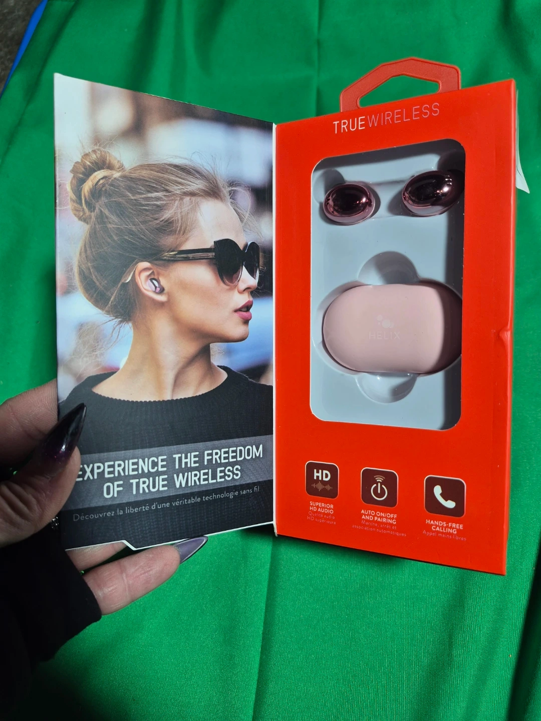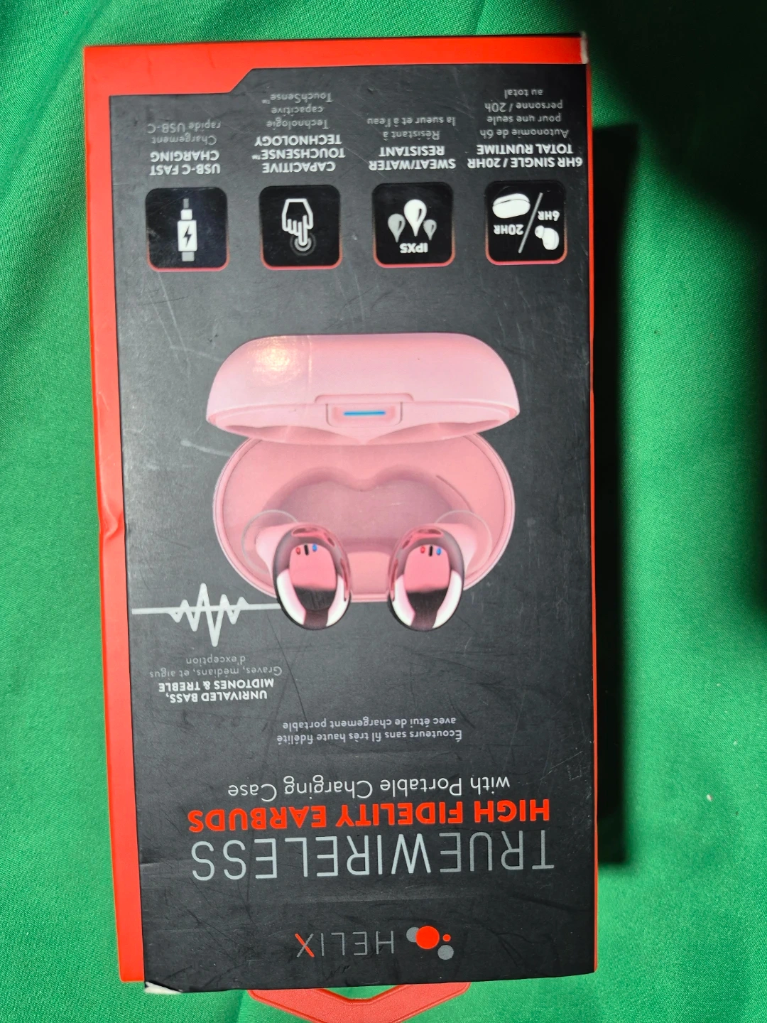 Selling a set of Helix True Wireless High Fidelity Earbuds in pink! These earbuds come with a portable charging case, making them perfect for on-the-go use. The box is included. They feature auto-pairing technology for effortless setup and are sweat and water-resistant. Enjoy up to 6 hours of playtime on a single charge, or up to 20 hours with the charging case