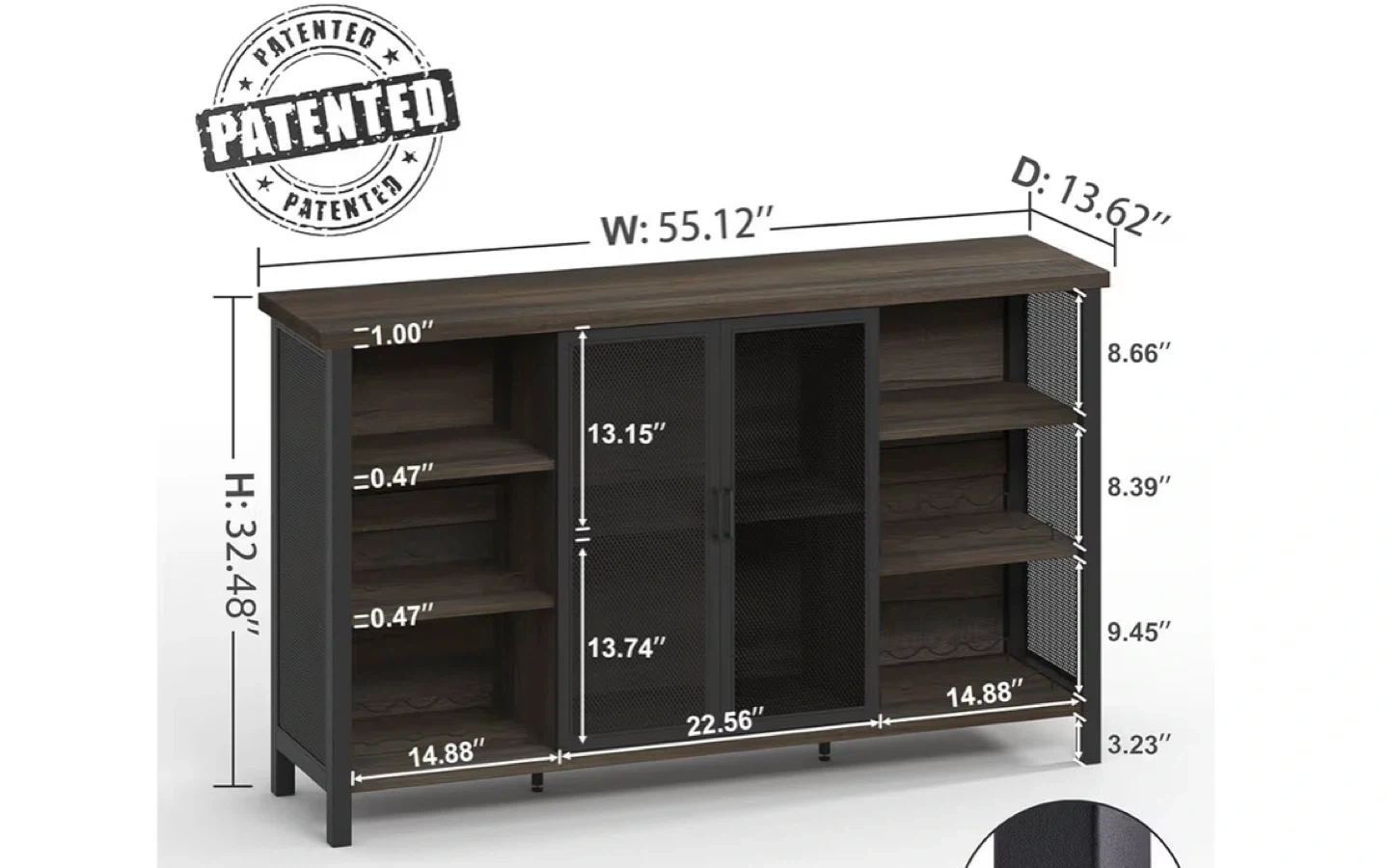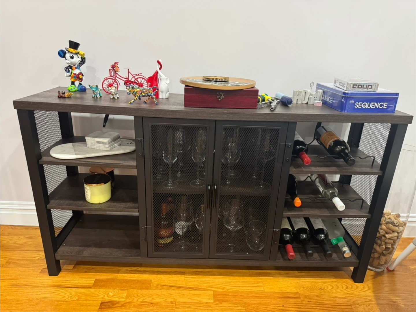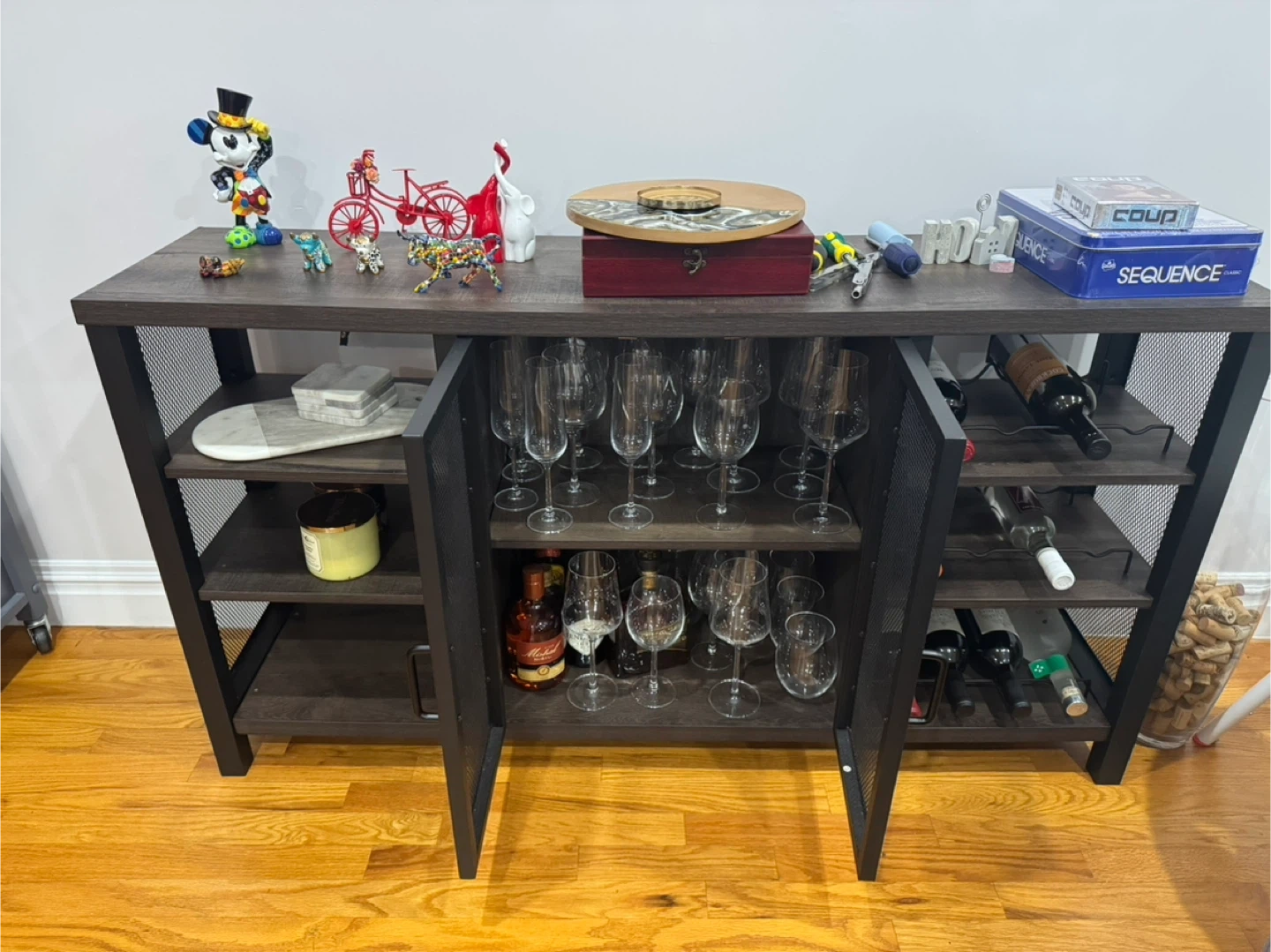Selling a stylish brown bar cabinet! It features mesh doors and open shelving on either side. The dimensions are approximately 55.12" wide, 32.48" high, and 13.62" deep. Perfect for storing your wine and glassware!