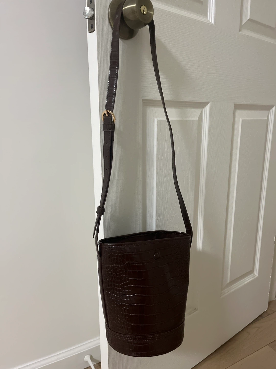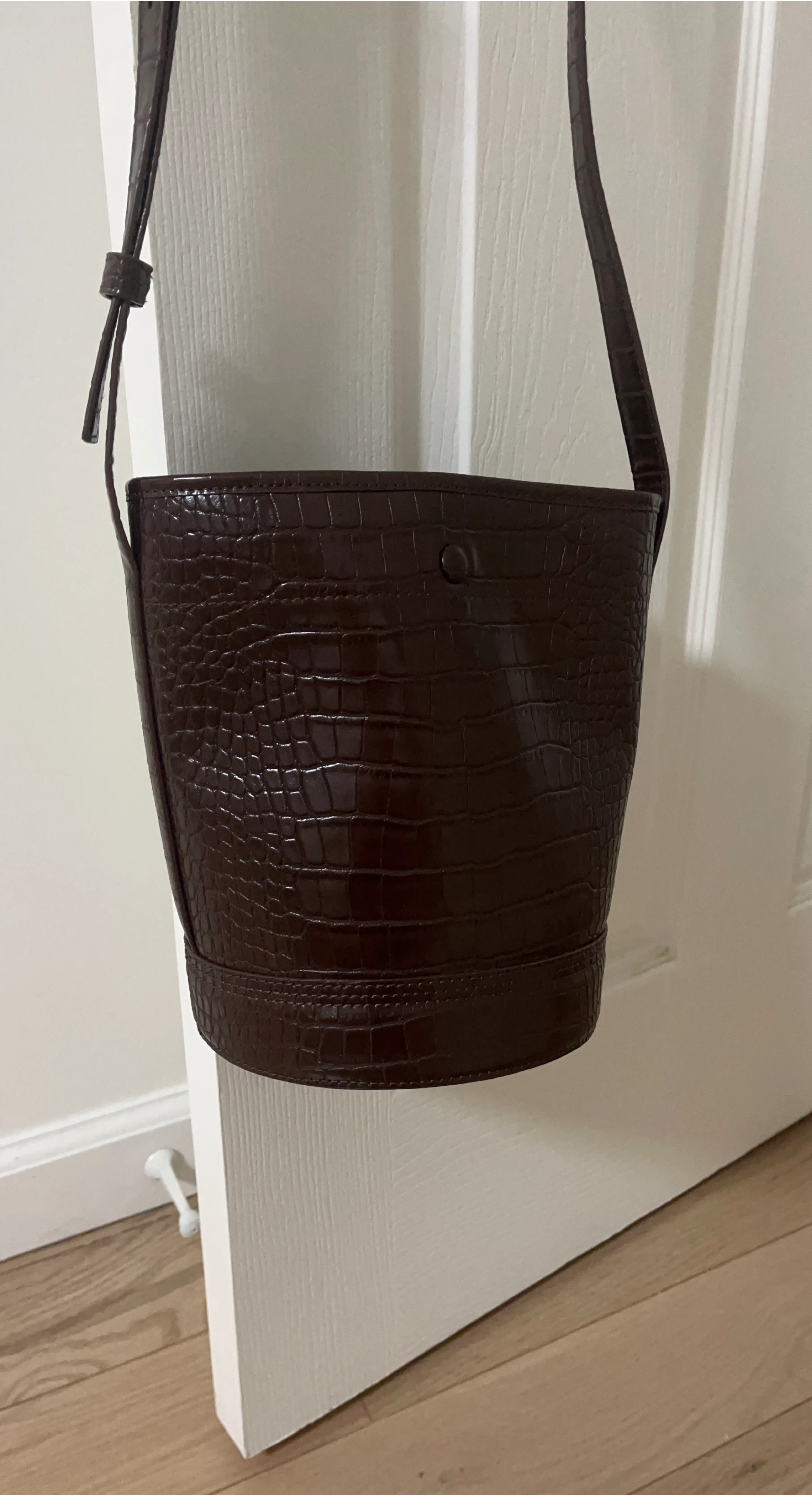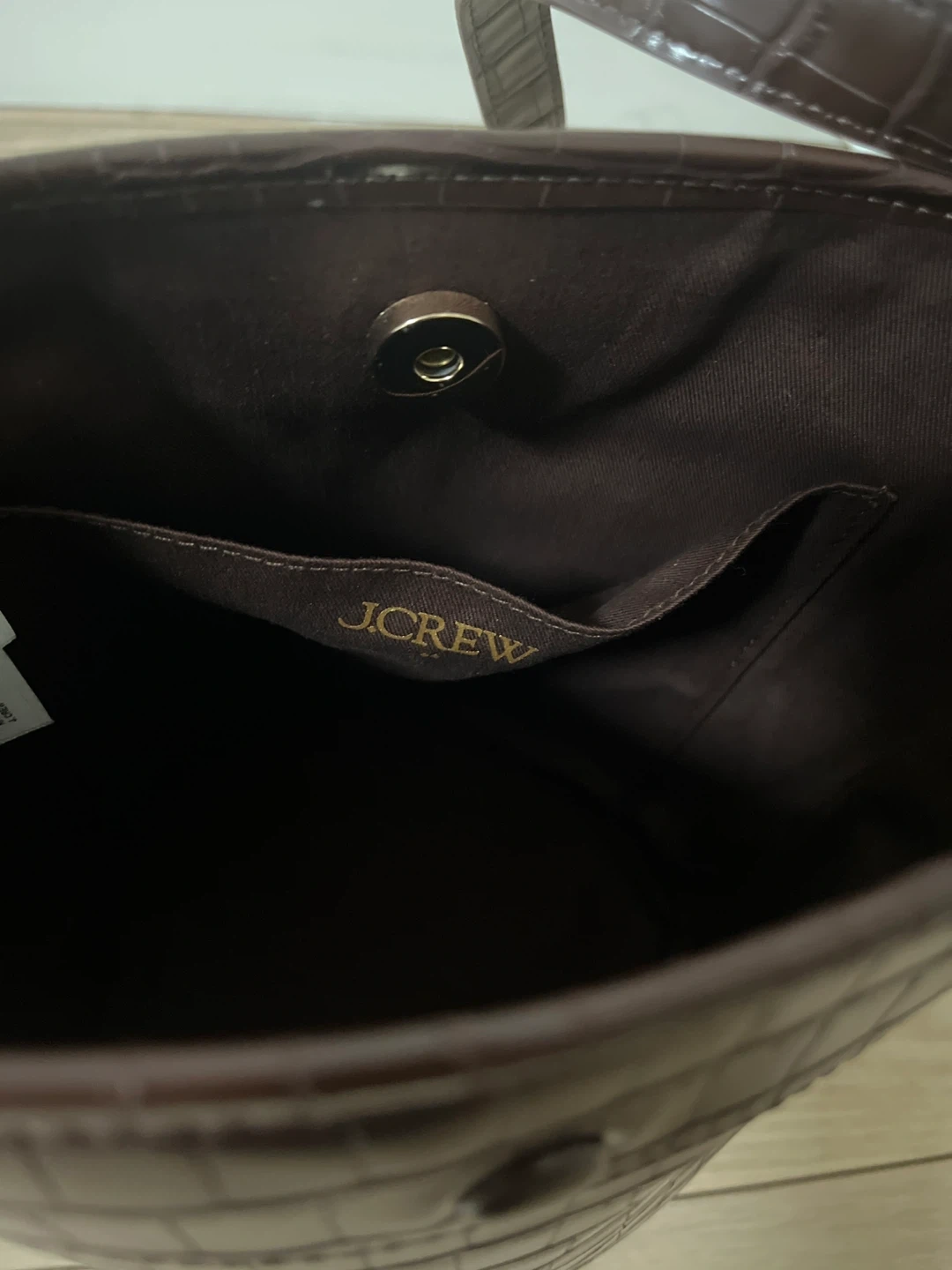 Here's a stylish J.Crew bucket bag with a unique crocodile embossed pattern. It's a beautiful brown color and is perfect for everyday use. The bag is in great condition and ready for a new owner!