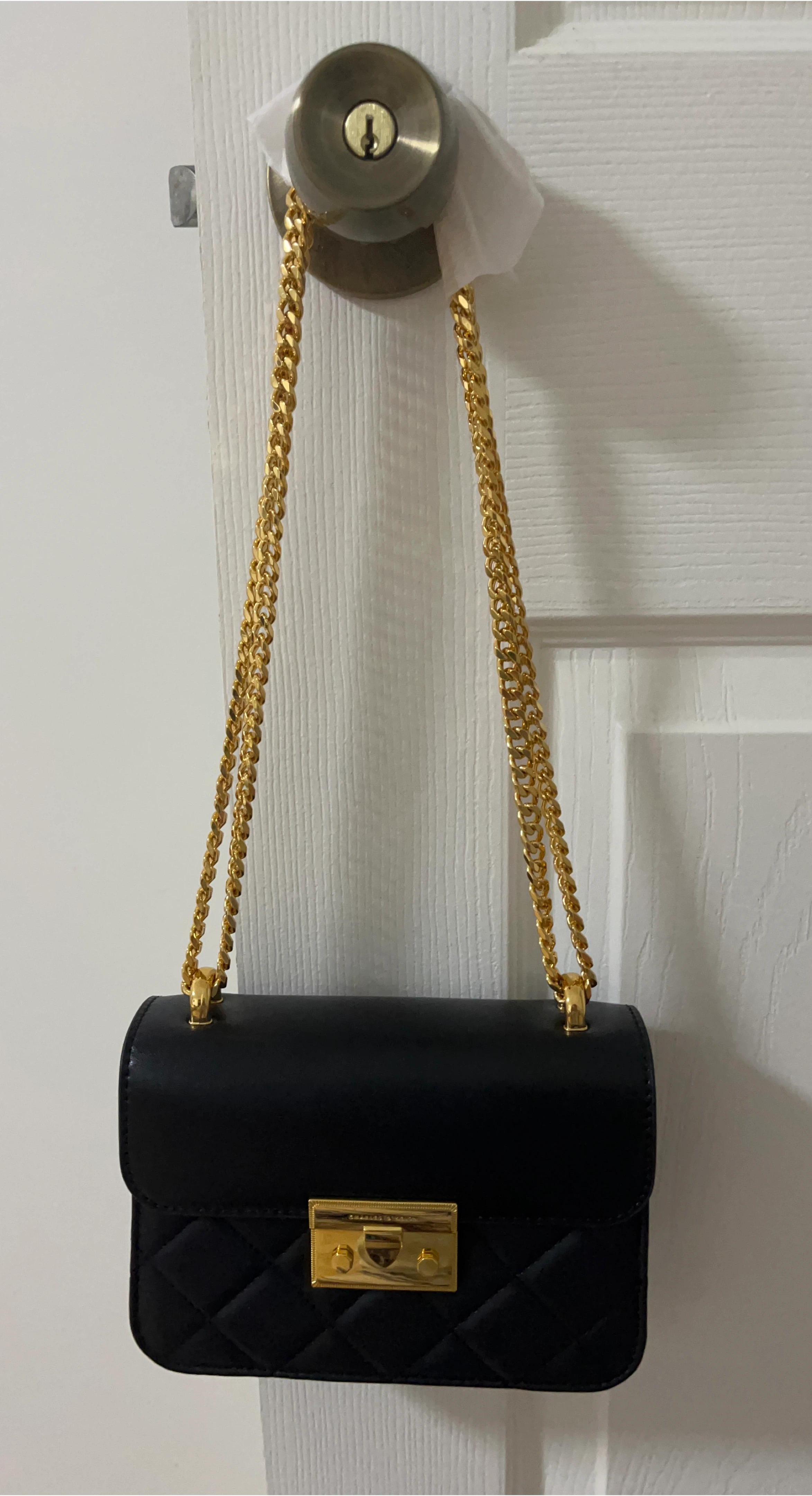 Selling a stylish Charles & Keith black shoulder bag. It features a gold chain strap and hardware, adding a touch of elegance to any outfit. The bag is in excellent new condition and ready for a new owner!