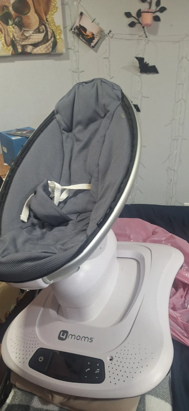 Selling a 4moms MamaRoo baby swing. It's in good condition and ready for a new little one to enjoy! This swing mimics natural motions to soothe your baby. It is perfect for keeping your baby calm and entertained