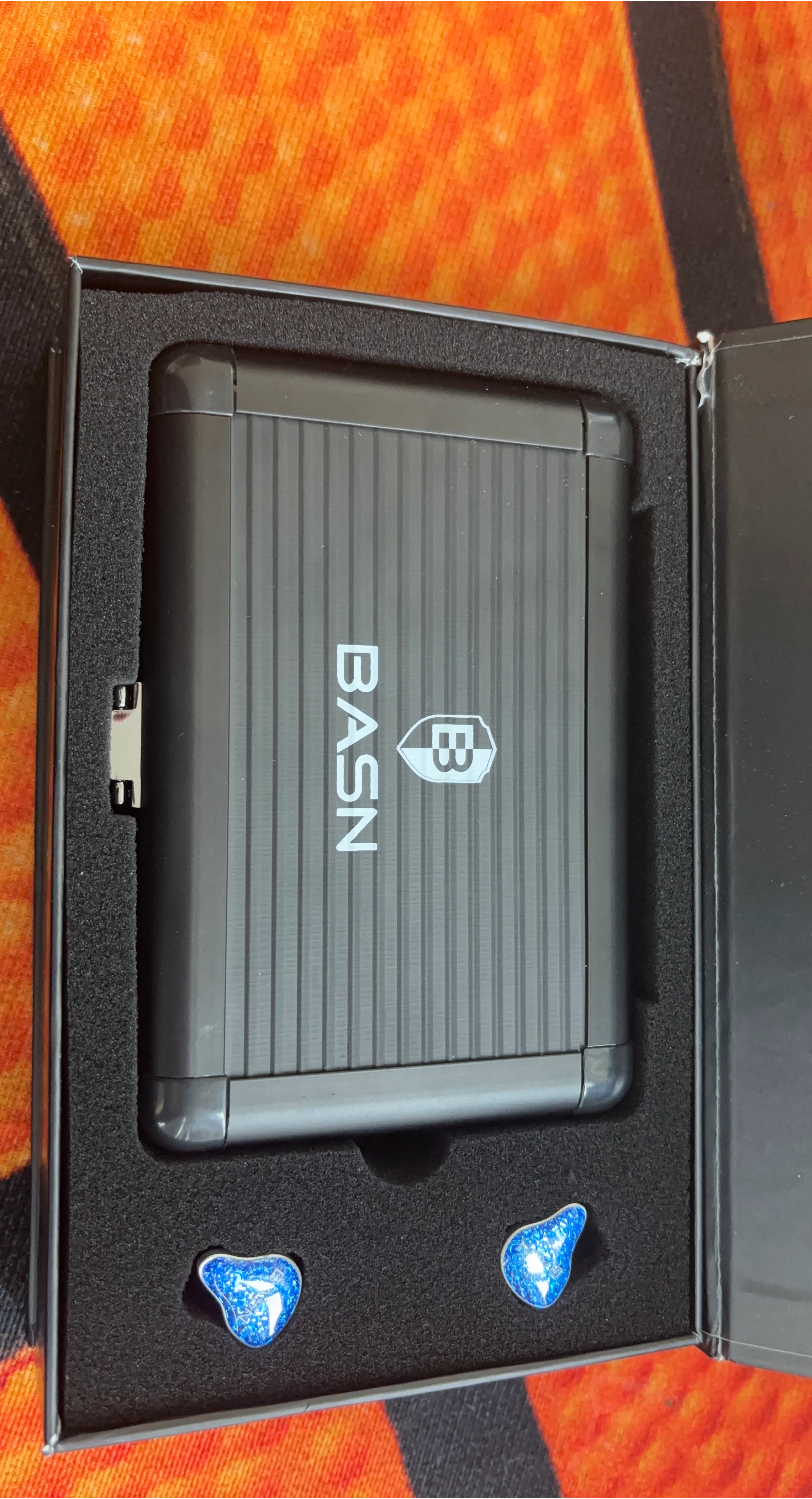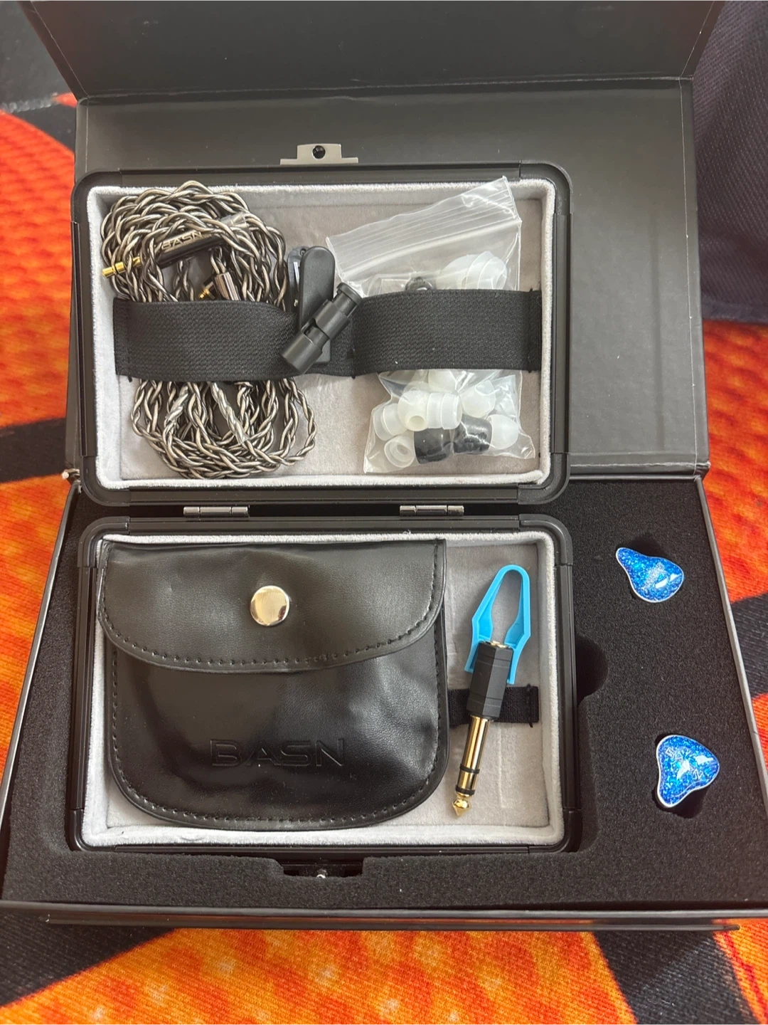 Selling a set of BASN in-ear monitor headphones. They come with a variety of accessories, including different sized ear tips, a cable, and a carrying case. The headphones are in excellent condition and come in the original box