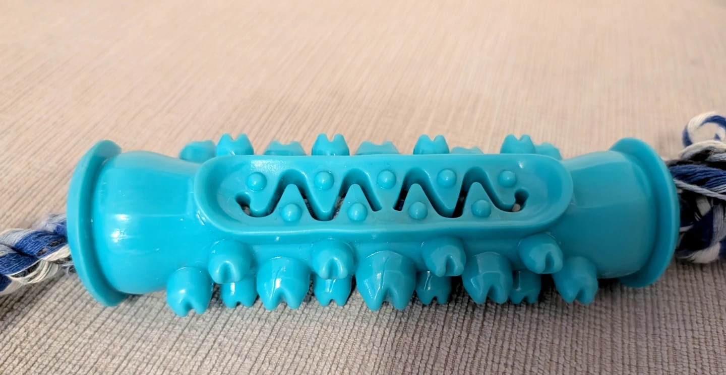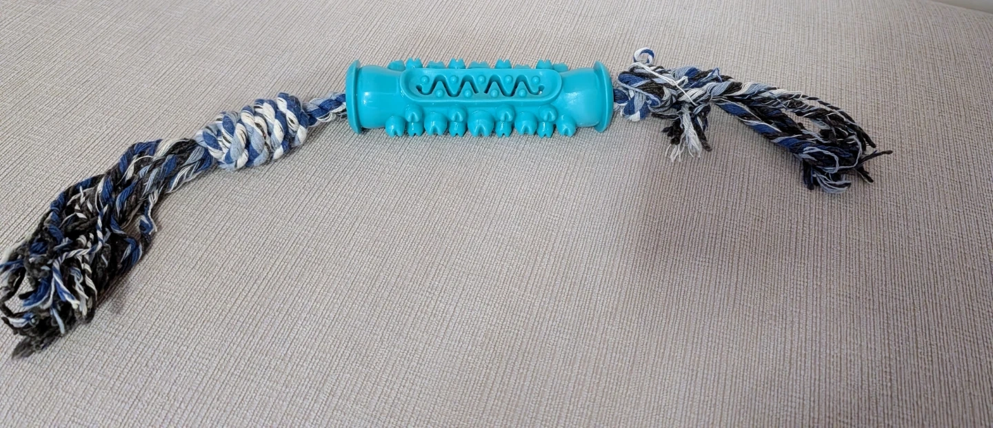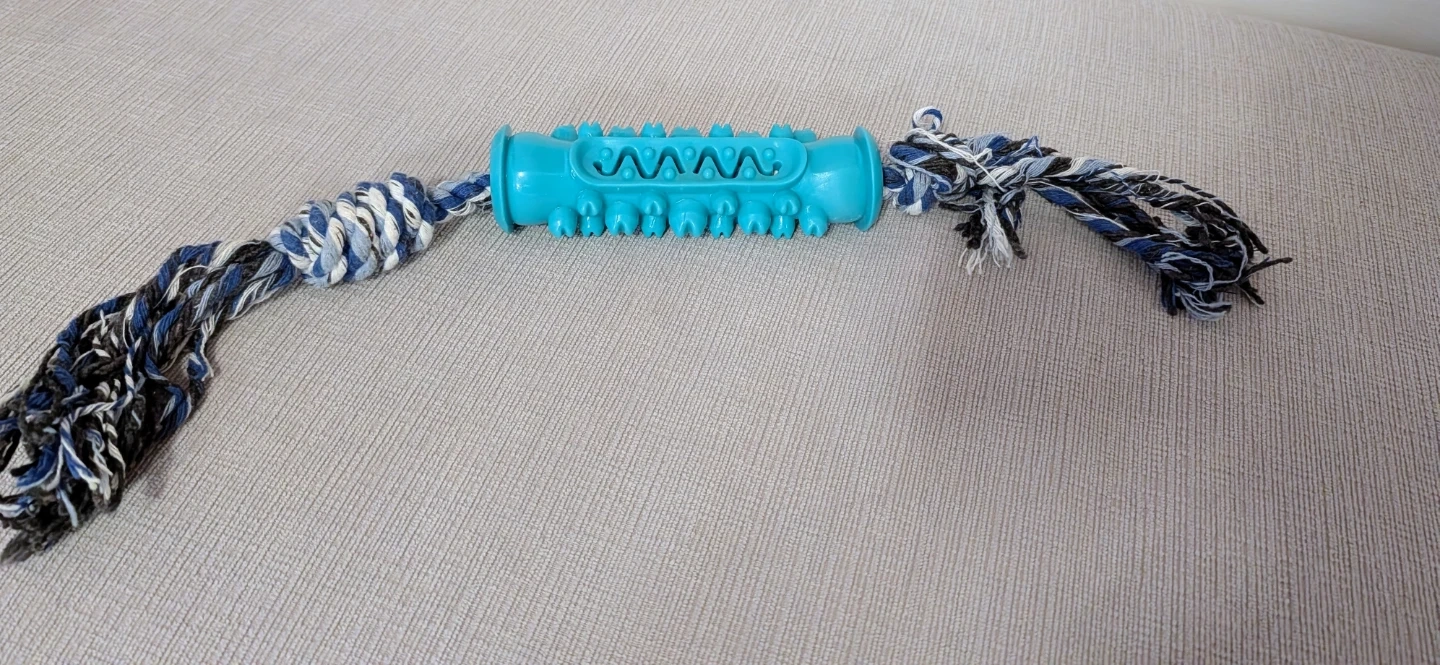 Here's a fun and durable dental chew toy for your furry friend! It features a textured centre for gentle teeth cleaning and a sturdy rope for tug-of-war fun. The bright blue colour makes it easy to spot during playtime. Perfect for keeping your dog entertained and maintaining their dental hygiene