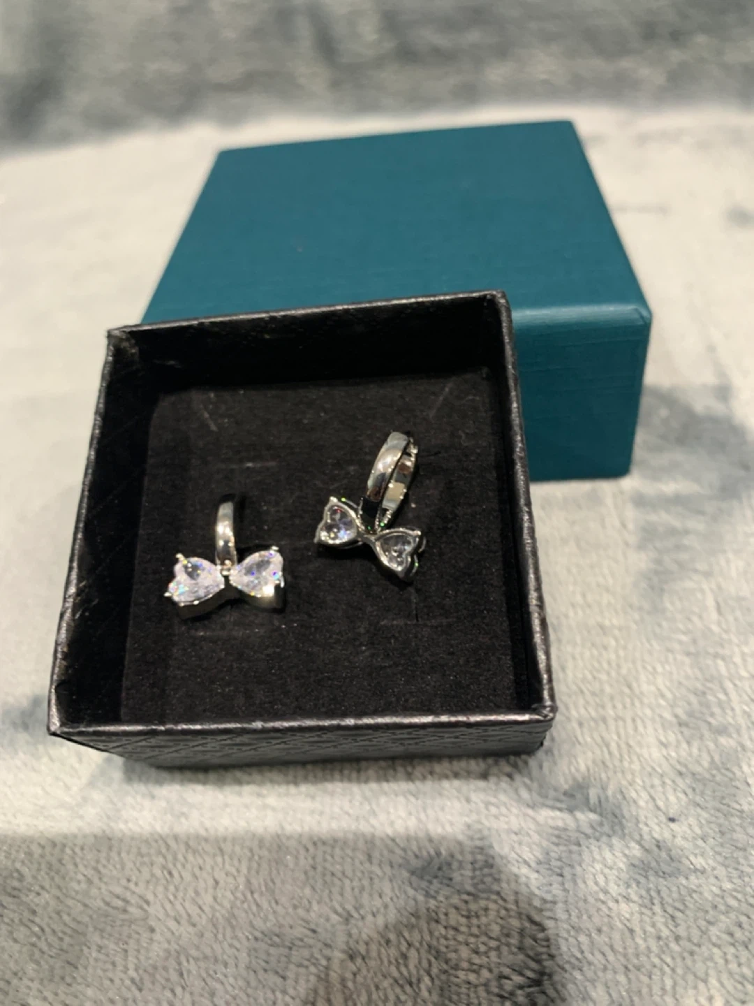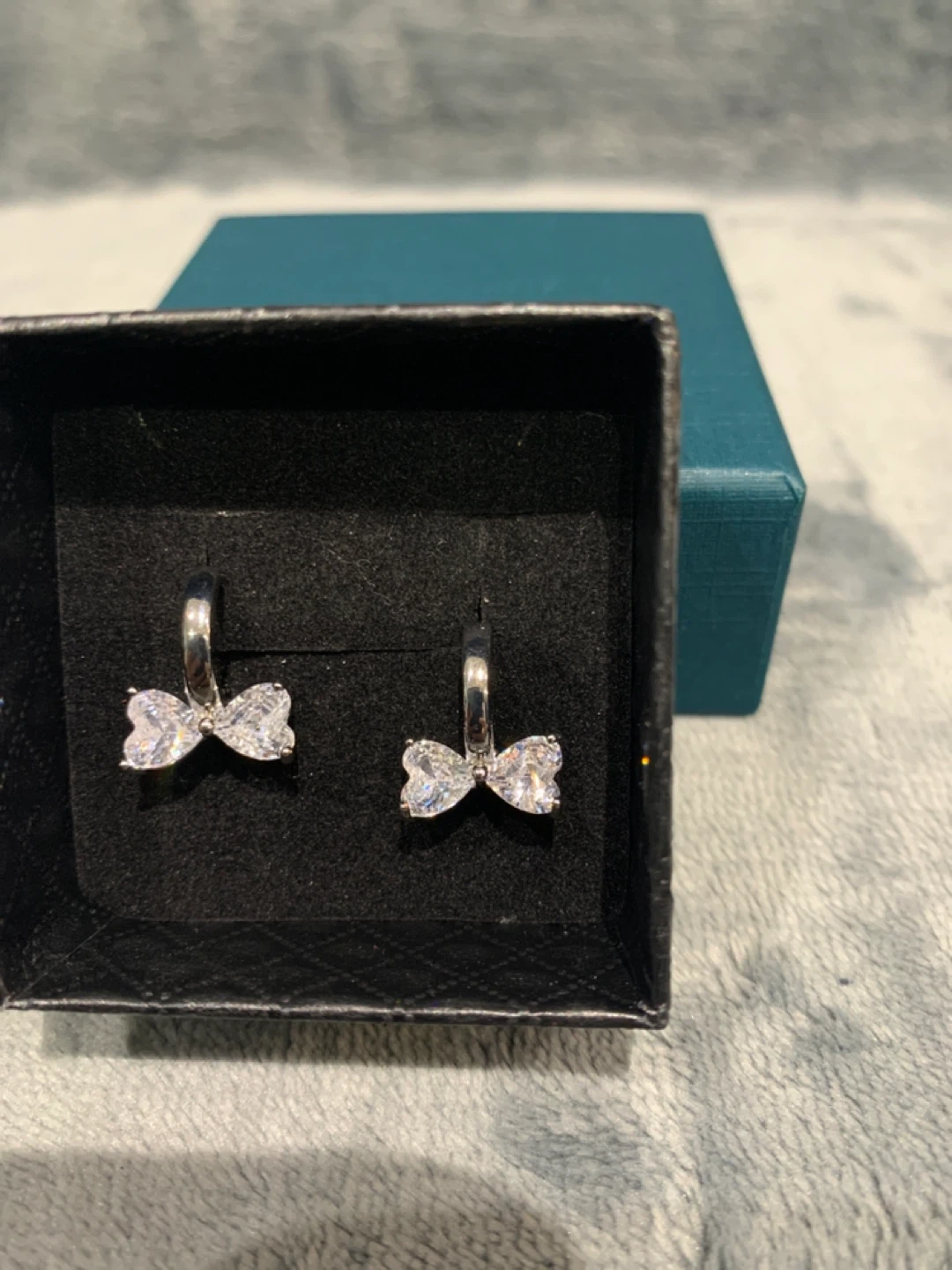 These are a pair of adorable bow earrings. They feature cubic stones and come in a box, perfect for gifting or keeping them safe! They add a touch of sparkle to any outfit