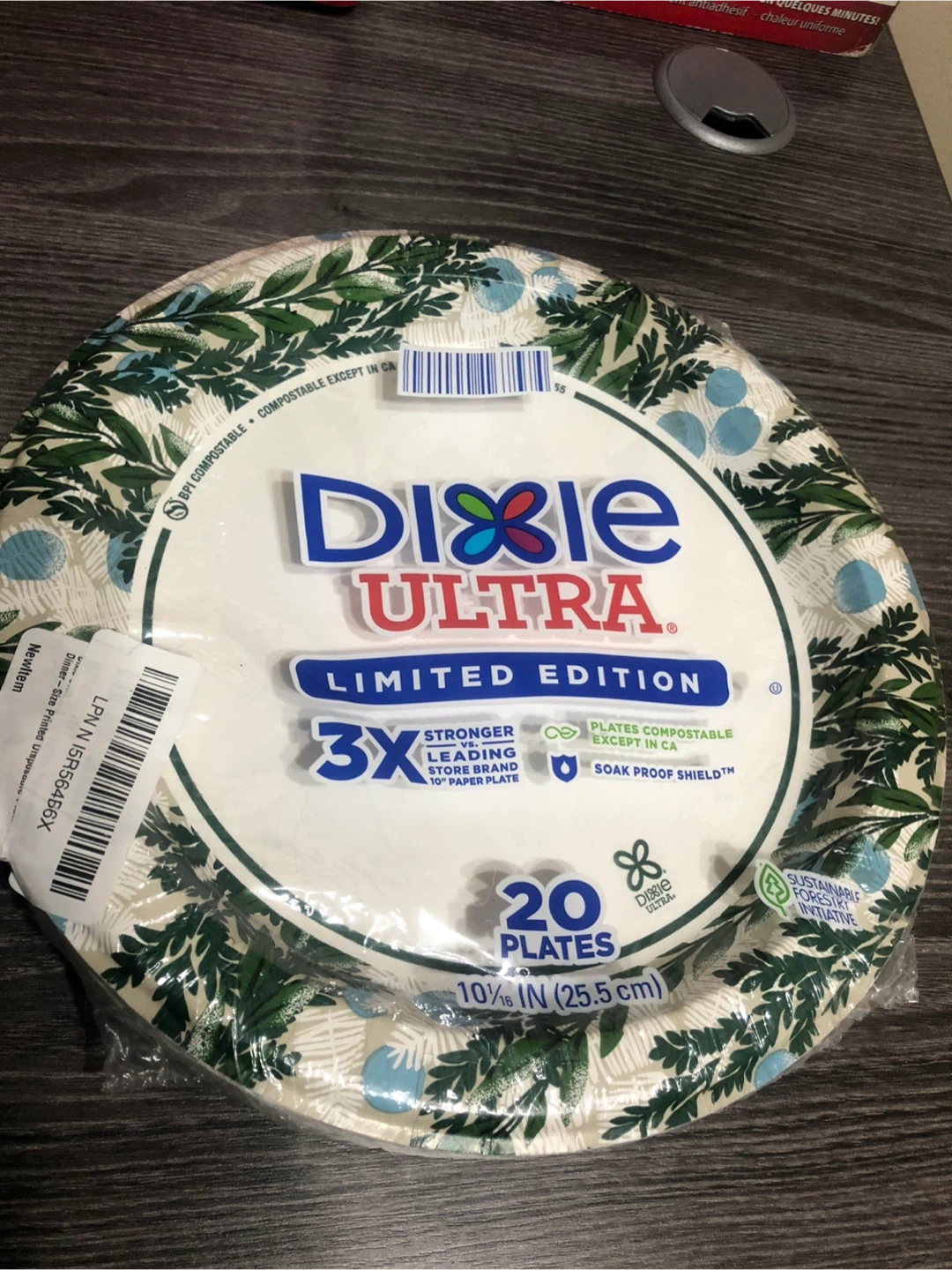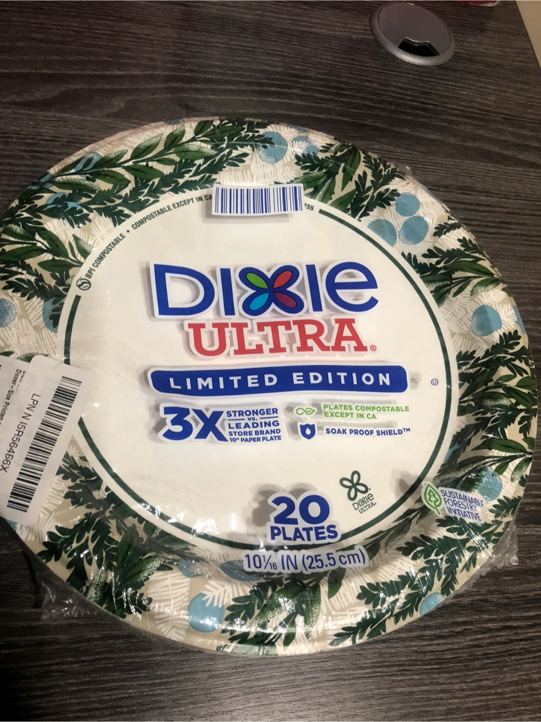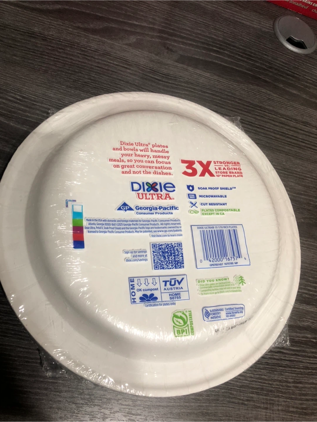 Selling a pack of Dixie Ultra Limited Edition paper plates. This pack contains 20 plates that are 10 1/16 inches (25.5 cm) in diameter. They're 3X stronger than leading store brand 10" paper plates and plates are compostable except in CA. They also have soak proof shield!