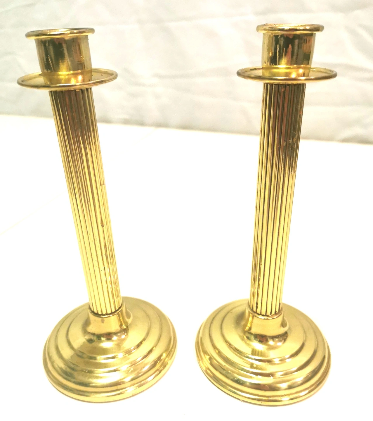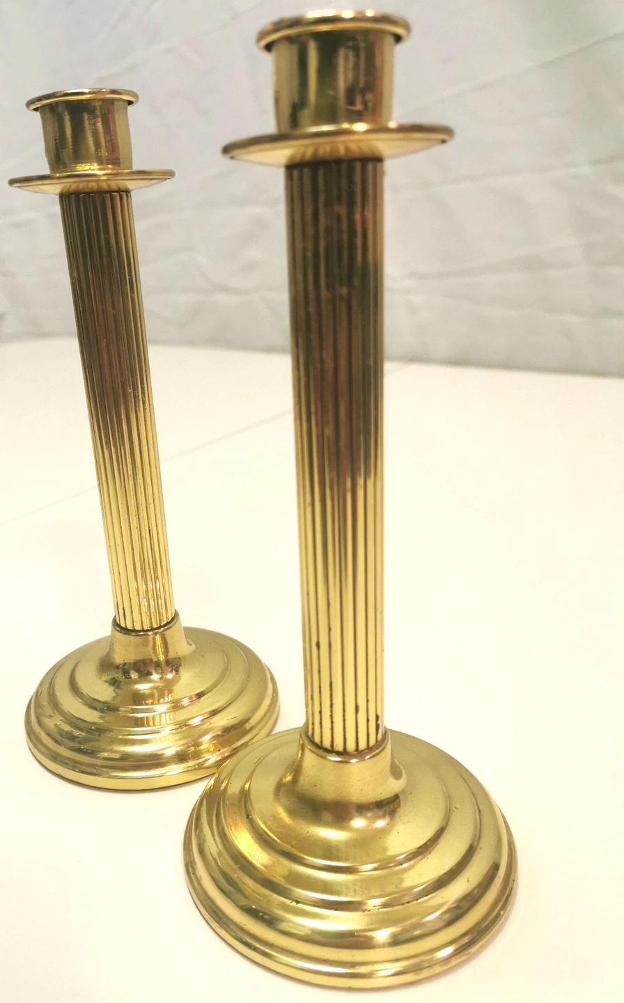 This is a classic pair of fluted column candlestick holders, standing 8 inches tall. These pieces feature a high-shine finish and a traditional Neoclassical silhouette that fits perfectly with Regency, Colonial, or Modern Traditional decor.