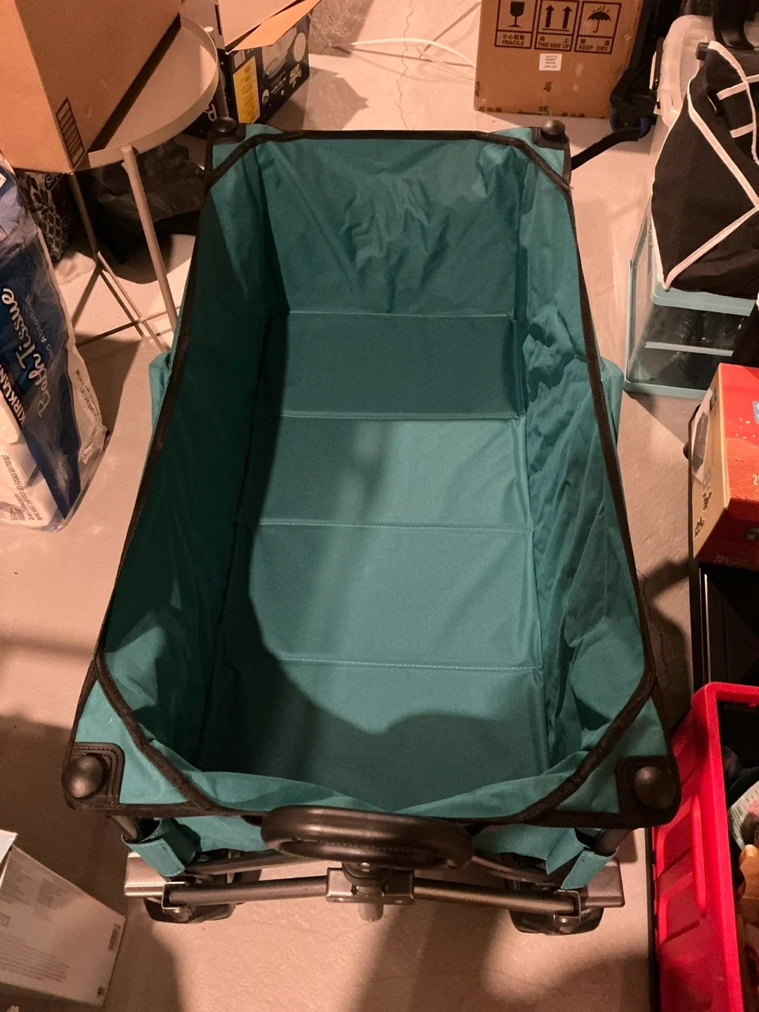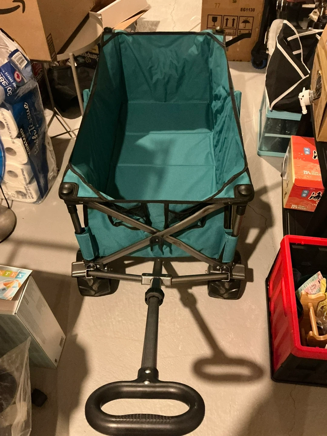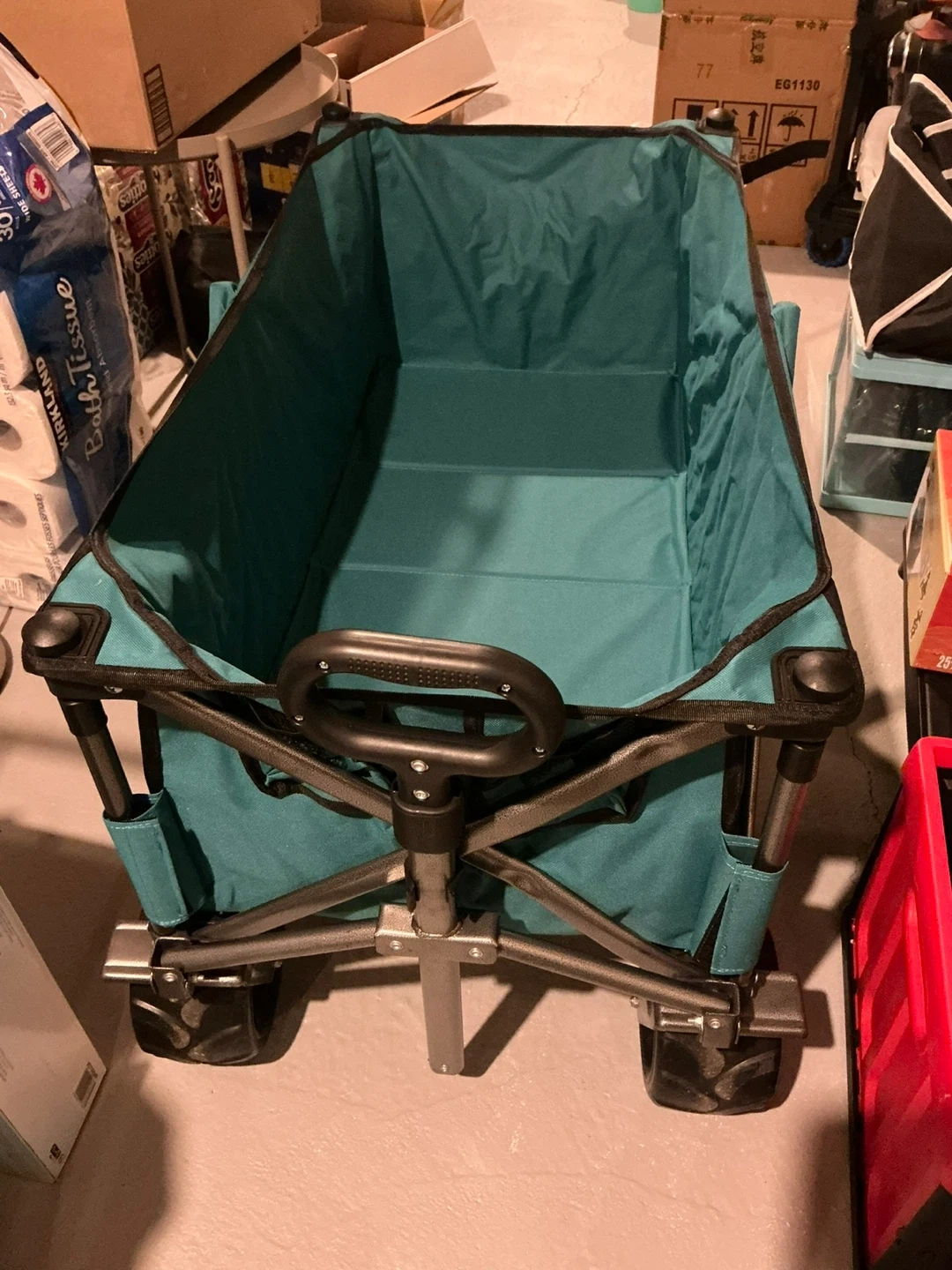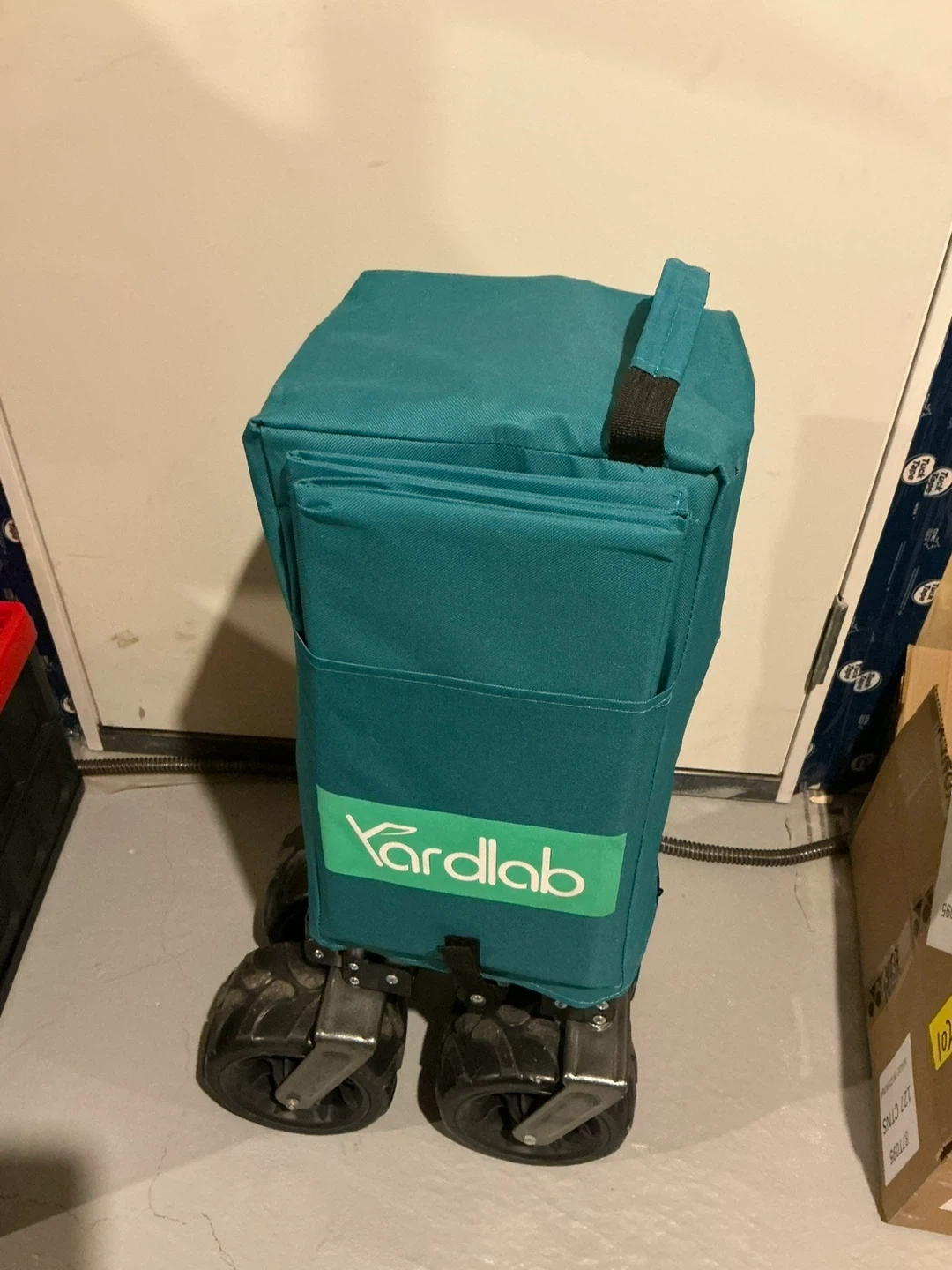 Here's a Yardlab collapsible wagon in teal! It's in great shape and ready to go. Perfect for hauling groceries, camping gear, or anything else you need to move around easily.