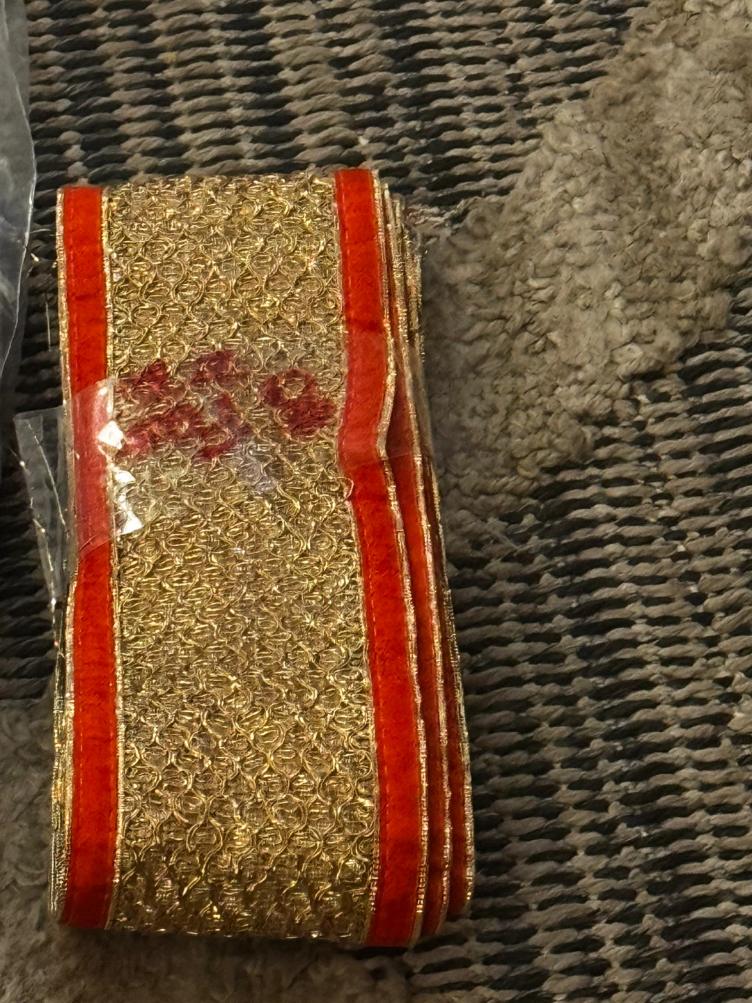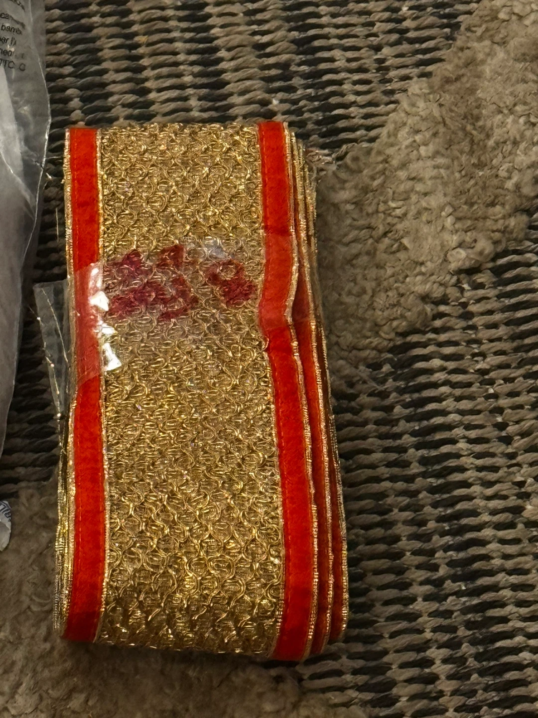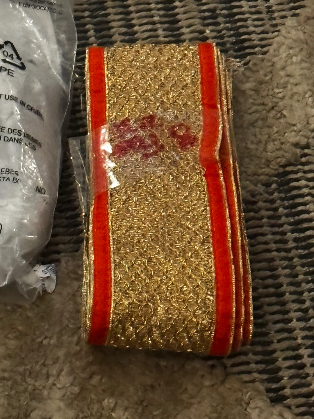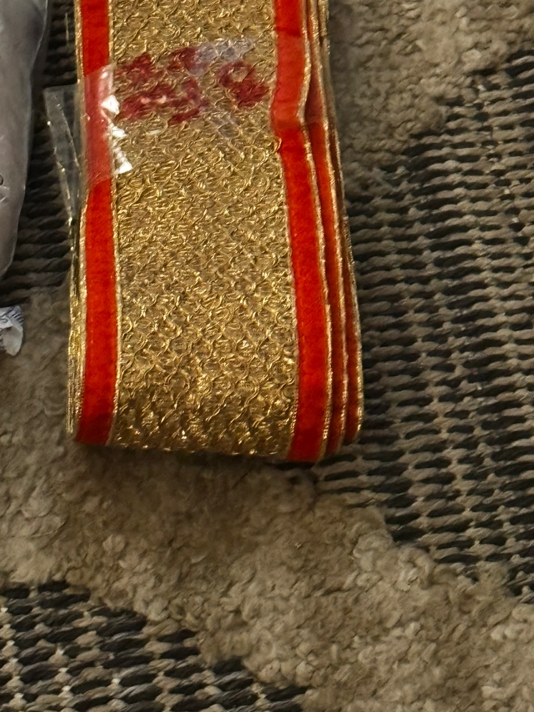 Selling a roll of gold and red decorative ribbon. It's still in its original packaging and ready for your next craft project or special event! The ribbon has a beautiful texture and vibrant colors.