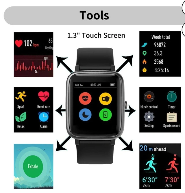 1.69 inch sensitive full touch screen with 240x280 resolution. This watch can display dynamic heart rate graphs, monitor changes in heart rate variability at any time, record your sleep status, measure your oxygen saturation blood, understand your physical condition, and then formulate a plan for a healthier life. Message sync reminder: Bluetooth connection between mobile phone and watch, information, WeChat, QQ, Facebook, Twitter, menstrual period and other information will be displayed, weather forecast, which will give you more intelligent Practical daily help: This fitness tracker is a good helper for walking, running, elliptical, fitness, cycling, cricket, swimming, rowing and more