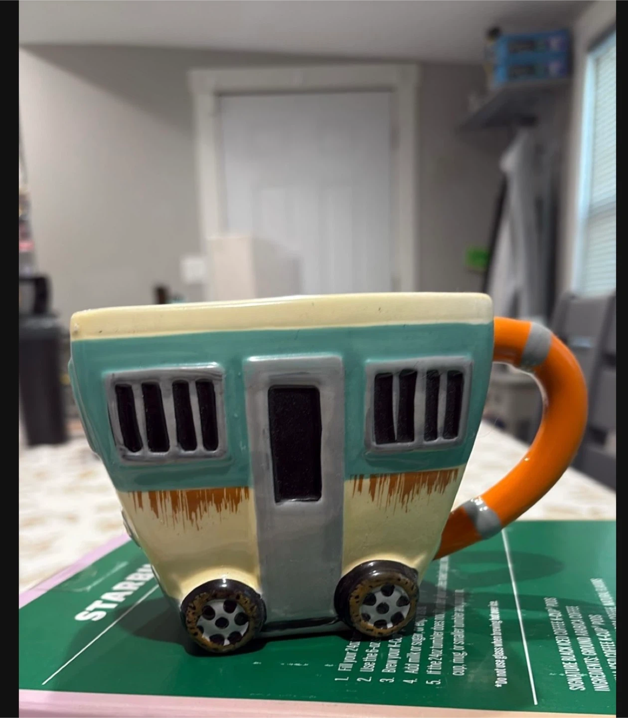 Here's a cute Starbucks mug shaped like a camper trailer! It has an orange handle shaped like a life preserver. Perfect for coffee or tea